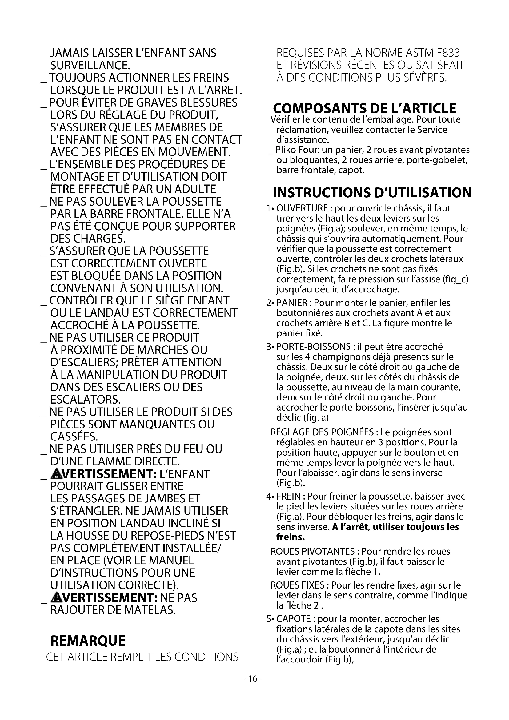 1• OUVERTURE : pour ouvrir le châssis, il faut tirer vers le haut les deux leviers sur les poignées (Fig.a); soulever, en même temps, le châssis qui s’ouvrira automatiquement. Pour vérifier que la poussette est correctement ouverte, contrôler les deux crochets latéraux (Fig.b). Si les crochets ne sont pas fixés correctement, faire pression sur l’assise (fig_c) jusqu’au déclic d’accrochage. 2• PANIER : Pour monter le panier, enfiler les boutonnières aux crochets avant A et aux crochets arrière B et C. La figure montre le panier fixé. 3• PORTE-BOISSONS : il peut être accroché sur les 4 champignons déjà présents sur le châssis. Deux sur le côté droit ou gauche de la poignée, deux, sur les côtés du châssis de la poussette, au niveau de la main courante, deux sur le côté droit ou gauche. Pour accrocher le porte-boissons, l’insérer jusqu’au déclic (fig. a) RÉGLAGE DES POIGNÉES : Le poignées sont réglables en hauteur en 3 positions. Pour la position haute, appuyer sur le bouton et en même temps lever la poignée vers le haut. Pour l’abaisser, agir dans le sens inverse (Fig.b). 4• FREIN : Pour freiner la poussette, baisser avec le pied les leviers situées sur les roues arrière (Fig.a). Pour débloquer les freins, agir dans le sens inverse. A l’arrêt, utiliser toujours les freins. ROUES PIVOTANTES : Pour rendre les roues avant pivotantes (Fig.b), il faut baisser le levier comme la flèche 1. ROUES FIXES : Pour les rendre fixes, agir sur le levier dans le sens contraire, comme l’indique la flèche 2 . 5• CAPOTE : pour la monter, accrocher les fixations latérales de la capote dans les sites du châssis vers l'extérieur, jusqu’au déclic (Fig.a) ; et la boutonner à l’intérieur de l’accoudoir (Fig.b),- 17 - 6• et au dossier de la poussette (Fig.c). La capote est dotée d’une fenêtre pour observer l’enfant, d’une grande poche pratique (Fig.d) et d’un lacet qui permet d’accrocher des jouets (Fig.e). Pour enlever la capote : décrocher les fixations latérales de la capote du châssis, en tirant vers l’intérieur, la déboutonner de l’intérieur de l’accoudoir et du dossier de la poussette. 7•En ouvrant la fermeture éclair, il est possible de détacher la partie arrière de tissu, en utilisant la capote comme pare-soleil (Fig.a). Pour raccrocher la partie arrière du tissu, fermer la fermeture éclair (Fig.b). 8•En baissant le dossier de la poussette, la capote arrière s’allonge et, grâce à la fermeture éclair avec double curseur, il est possible de créer une fenêtre pour faire passer davantage d’air et observer l’enfant quand il dort. 9•CEINTURE DE SÉCURITÉ À 5 POINTS : pour l’accrocher, insérer les deux clips de la sangle ventrale (avec les bretelles accrochées, flèche_a) dans la sangle d’entrejambes jusqu’au déclic (flèche_b). Pour le détacher, appuyer sur le bouton situé au centre de la bouche (flèche c) et tirer vers l’extérieur la ceinture ventrale (flèche d). 10•Pour serrer la sangle ventrale, tirer, des deux côtés, dans le sens de la flèche (Fig.a), pour la desserrer procéder dans le sens inverse. La sangle ventrale peut être serrée jusqu’à la butée de sécurité (Fig.b). 11•Pour régler la hauteur des ceintures de sécurité, il faut décrocher les deux clips à l’arrière du dossier. Tirer vers soi les bretelles (flèche_a) jusqu’à décrocher les clips et les enfiler dans les boutonnières du dossier (flèche b). Enlever les bretelles de la housse (flèche c) et les enfiler dans la boutonnière la plus adaptée (flèche d), enfin accrocher de nouveau les deux clips derrière le dossier (flèche e). L’accrochage correct des clips est déterminé par le déclic (fig.f). 12•RÉGLAGE DU REPOSE-PIEDS : Le repose-pieds est réglable en 2 positions. Pour baisser le repose-pieds, tirer les deux leviers latéraux vers le bas et, en ême temps, le baisser. Pour soulever le repose-pieds, le pousser vers le haut jusqu’au déclic. 13•RÉGLAGE DU DOSSIER : Le dossier est réglable en quatre positions. Pour baisser le dossier, soulever la poignée et, en même temps, baisser le dossier, en le bloquant dans la position souhaitée. Pour le soulever, pousser le dossier vers le haut. 14•MAIN COURANTE : pour fixer la main courante, insérer ses deux extrémités dans les accoudoirs jusqu’au déclic. 15•Il est possible d’ouvrir la main courante seulement d’un côté pour faciliter l’entrée et la sortie de l’enfant quand il est plus grand. Pour ouvrir, appuyer sur le bouton situé sous l’accoudoir et, en même temps, tirer la main courante vers l’extérieur (Fig.a). Pour enlever la main courante, appuyer sur les deux boutons situés sous les accoudoirs et, en même temps, tirer la main courante vers l’extérieur (Fig.b). 16•Après avoir enlevé la barre frontale, introduire les cachess fournis pour refermer les accoudoirs du châssis. 17•MARCHEPIED ARRIÈRE : Le marchepied arrière facilite maman pour franchir de petits obstacles et il peut aussi transporter un deuxième enfant (fig_a). SÉQUENCE D’INSTALLATION D'ENFANTS: Pour utiliser le Pliko Four avec deux enfants (fig_b), il faut d’abord freiner la poussette, puis positionner l’enfant plus petit dans le siège et fixer la ceinture de sécurité (1). Prendre les poignées (2) et faire monter le deuxième enfant sur le marchepied (3).