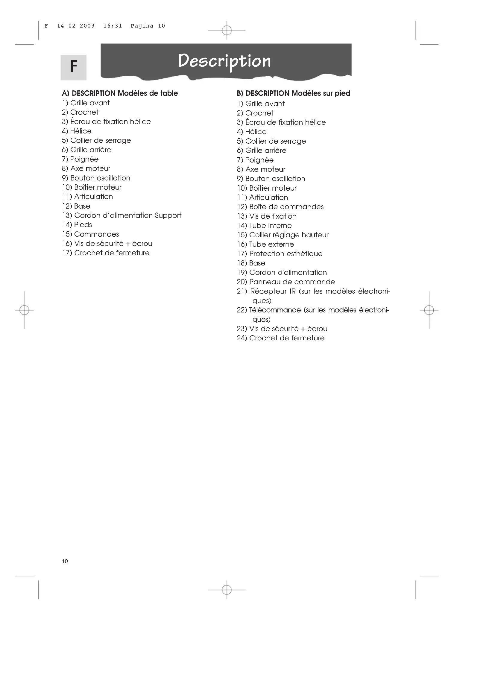 - Éviter les produits inflammables et abrasifs. Consignes importantes Cet appareil est conforme à la directive CEE/89/336 antiparasitage. Le Fabricant décline toute responsabilité dans le cas d’accidents causés par l’inobser- vation de la notice, usage impropre ou négligence de la part de l’utilisateur. F 14-02-2003 16:31 Pagina 1216 A) BESCHRIJVING Tafelmodellen