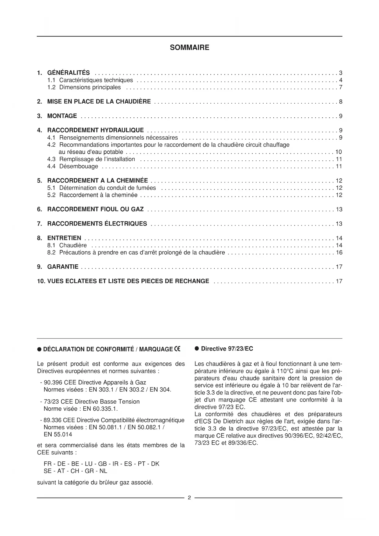 - GT 400 GT 400 K GT 400 DIEMATIC-m Delta Chaudières fioul/gaz Öl/Gas-Spezialheizkessel 03/02/04 - 94860196 FRANÇAIS pages 1 à 17 DEUTSCH Seiten 19 bis 35 Notice de montage, d'installation et d'entretien Montage-,Installations- und Wartungsanleitung 82294054 H BE - CH - DZ - FR - MA - PT - RO - TN - AT - CZ - DE - HR - LT - LU - LV - SI - SK2 Le présent produit est conforme aux exigences des Directives européennes et normes suivantes : - 90.396 CEE Directive Appareils à Gaz Normes visées : EN 303.1 / EN 303.2 / EN 304. - 73/23 CEE Directive Basse Tension Norme visée : EN 60.335.1. - 89.336 CEE Directive Compatibilité électromagnétique Normes visées : EN 50.081.1 / EN 50.082.1 / EN 55.014 et sera commercialisé dans les états membres de la CEE suivants : FR - DE - BE - LU - GB - IR - ES - PT - DK SE - AT - CH - GR - NL suivant la catégorie du brûleur gaz associé. Les chaudières à gaz et à fioul fonctionnant à une tem- pérature inférieure ou égale à 110°C ainsi que les pré- parateurs d'eau chaude sanitaire dont la pression de service est inférieure ou égale à 10 bar relèvent de l'ar- ticle 3.3 de la directive, et ne peuvent donc pas faire l'ob- jet d'un marquage CE attestant une conformité à la directive 97/23 EC. La conformité des chaudières et des préparateurs d'ECS De Dietrich aux règles de l'art, exigée dans l'ar- ticle 3.3 de la directive 97/23/EC, est attestée par la marque CE relative aux directives 90/396/EC, 92/42/EC, 73/23 EC et 89/336/EC. SOMMAIRE 1. GÉNÉRALITÉS p. 3