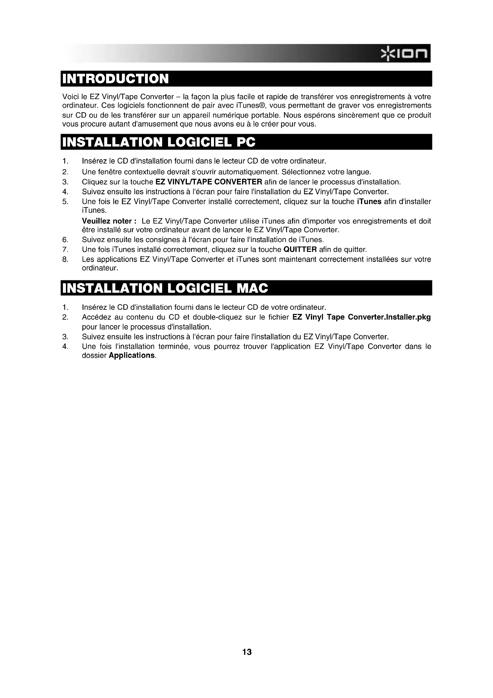INTRODUCTION Voici le EZ Vinyl/Tape Converter – la façon la plus facile et rapide de transférer vos enregistrements à votre ordinateur. Ces logiciels fonctionnent de pair avec iTunes®, vous permettant de graver vos enregistrements sur CD ou de les transférer sur un appareil numérique portable. Nous espérons sincèrement que ce produit vous procure autant d'amusement que nous avons eu à le créer pour vous.