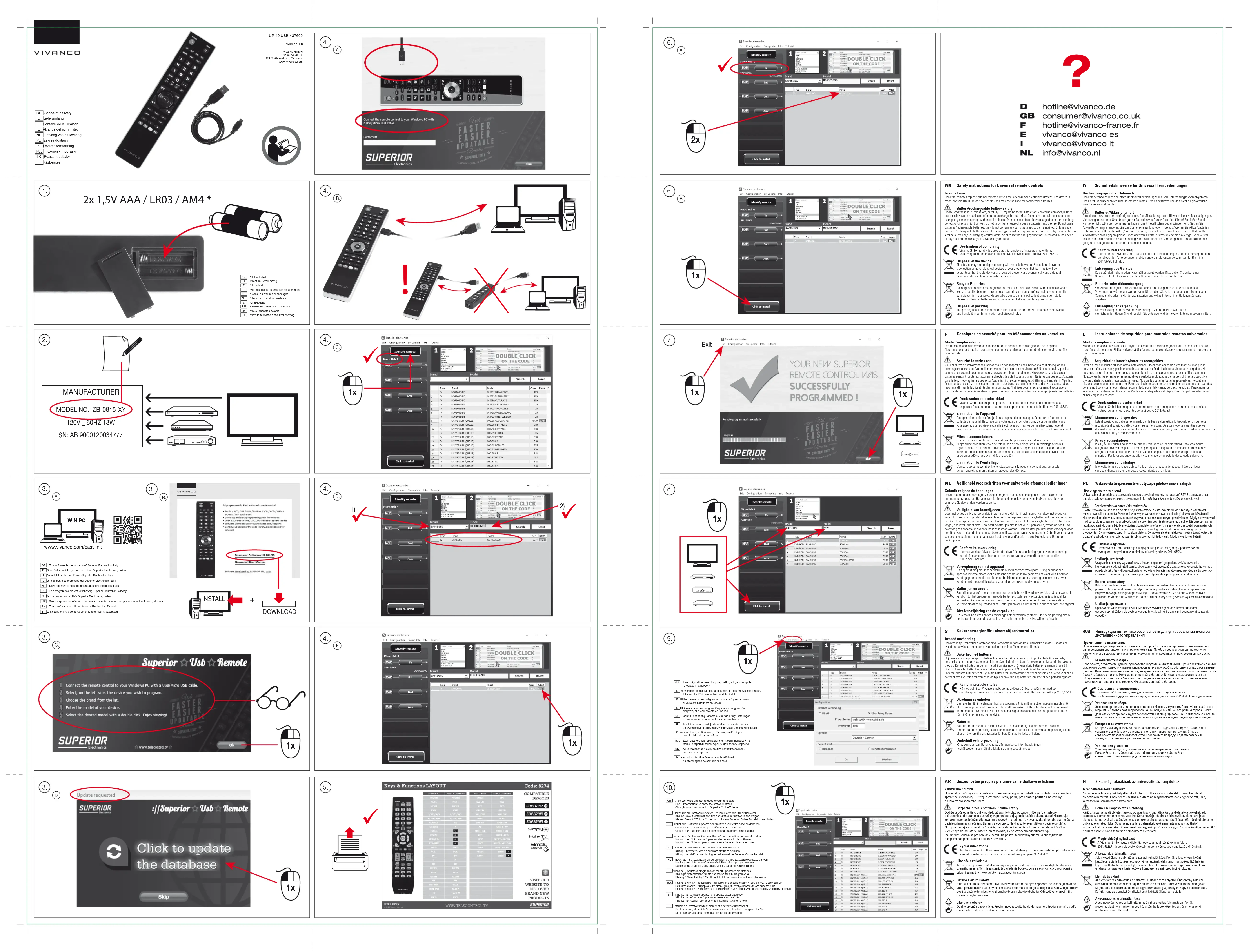 Consignes de sécurité pour les télécommandes universelles Mode d’emploi adéquat Des télécommandes universelles remplacent les télécommandes d'origine, etc des appareils électroniques grand public. Il est conçu pour un usage privé et il est interdit de s’en servir à des fins commerciales. Sécurité batterie / accu Veuillez suivre attentivement ces indications. Le non-respect de ces indications peut provoquer des dommages/blessures et éventuellement même l'explosion d'accus/batteries! Ne courtcircuitez pas les contacts, par exemple par un entreposage avec des objets métalliques. N'exposez jamais des accus/batteries pendant longtemps aux rayons directes de soleil ou à la chaleur. Ne jetez pas des accus/batteries dans le feu. N'ouvrez jamais des accus/batteries, ils ne contiennent pas d'éléments à entretenir. Veuillez échanger des accus/batteries seulement contre des batteries du même type ou des types comparables recommandés par le fabricant. Seulement pour accus: N'utilisez pour le rechargement d'accus que la fonction de recharge intégrée dans l'appareil ou des chargeurs adaptés. Ne rechargez jamais des batteries. Declaración de conformidad Vivanco GmbH déclare par la présente que cette télécommande est conforme aux exigences fondamentales et autres prescriptions pertinentes de la directive 2011/65/EU. Elimination de l’appareil Cet appareil ne doit pas être jeté dans la poubelle domestique. Remettez-le à un point decollecte de matériel électrique dans votre quartier ou votre zone. De cette manière, vousvous assurez que les vieux appareils électriques sont traités de manière scientifique et professionnelle, évitant ainsi de potentiels dommages causés à la santé et à l’environnement. Piles et accumulateurs Les piles et accumulateurs ne doivent pas être jetés avec les ordures ménagères. Ils fontl'objet d'une obligation légale de retour, afin de pouvoir garantir un recyclage selon lesrègles et dans le respect de l'environnement. Veuillez apporter les piles usagées dans uncentre de collecte communale ou un commerce. Les piles et accumulateurs doivent êtreentièrement déchargés avant d'être rapportés. Elimination de l'emballage L’emballage est recyclable. Ne le jetez pas dans la poubelle domestique, amenezleau bon endroit pour un traitement adéquat des déchets.