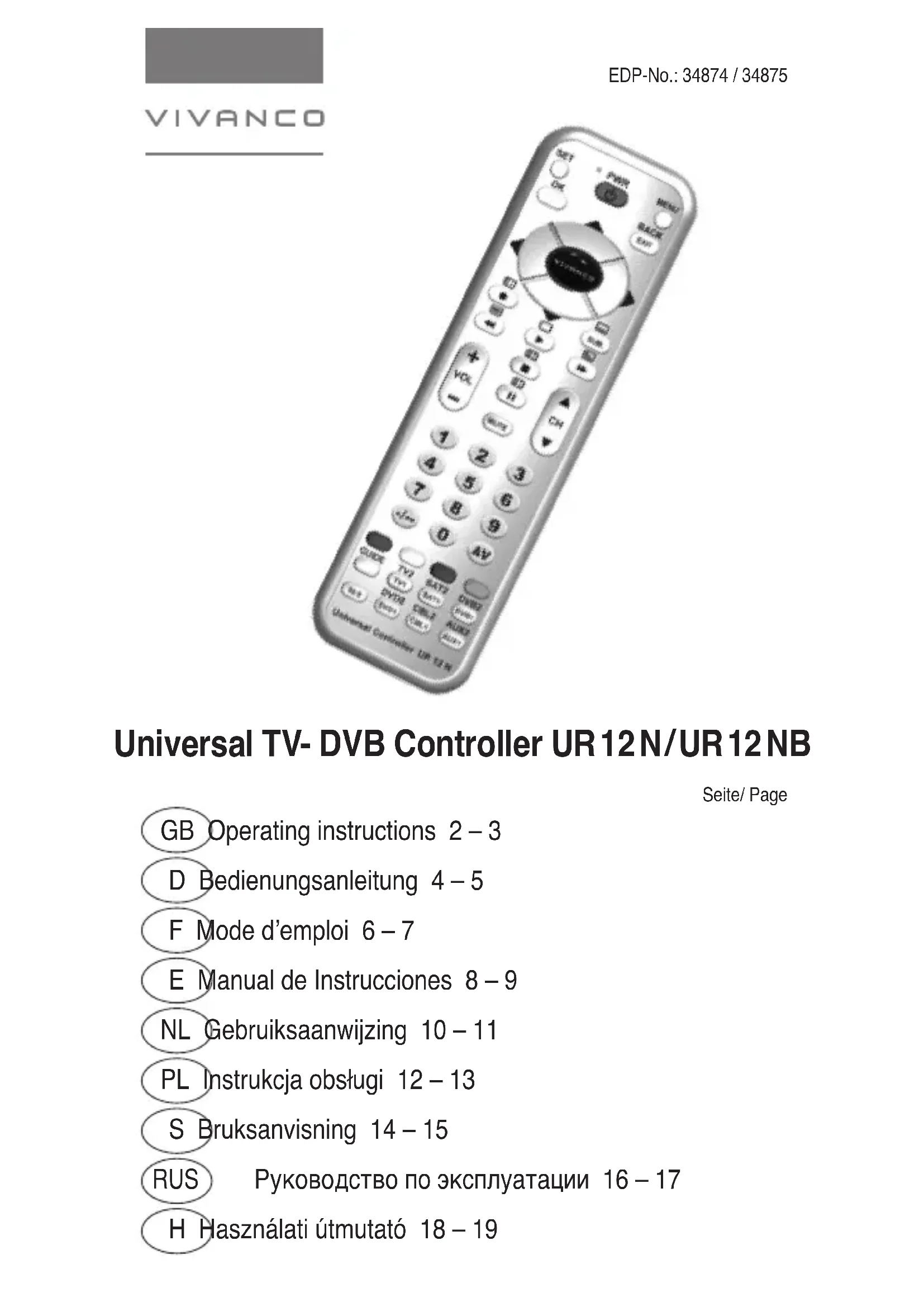 UR 12 NB - Télécommande VIVANCO - Notice d'utilisation et mode d'emploi gratuit