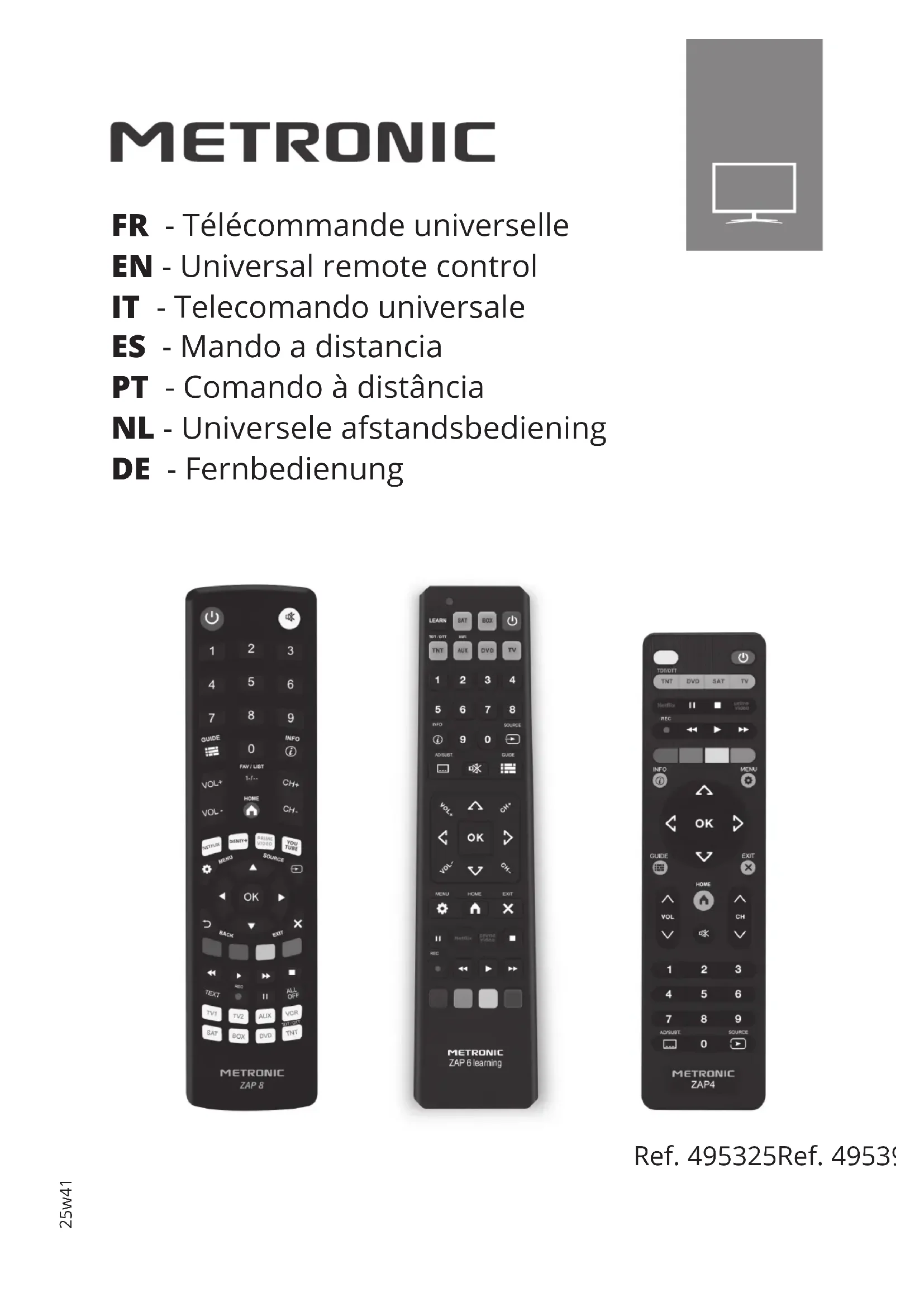 25w41 FR - Télécommande universelle EN - Universal remote control IT - Telecomando universale ES - Mando a distancia PT - Comando à distância NL - Universele afstandsbediening DE - Fernbedienung Ref. 495325Ref. 495398Ref. 495328AVANT PROPOS Nous vous remercions d’avoir choisi une télécommande universelle METRONIC et sommes persuadés qu’elle vous donnera entière satisfaction. Selon le modèle, vous pouvez piloter 3, 6 ou 8 appareils (TV, récepteur satellite, lecteur DVD, chaîne Hi-Fi (AUX), adaptateur TNT et/ou BOX TV (Orange uniquement). Après avoir mis les piles 1.5V AAA (non fournies) dans l’emplacement prévu à cet eet, vous pourrez ins- taller votre télécommande pour chaque type d’appareil à commander. La télécommande universelle ME- TRONIC est conçue pour commander la plupart des appareils de chaque marque. Pour cela, vous avez le choix entre trois méthodes d’installation : par code Marque, par recherche automatique ou par appren- tissage. Dans les procédures ci-dessous, nous donnons un exemple pour le téléviseur (TV). Pour installer, par exemple, votre adaptateur TNT ou votre récepteur satellite, remplacez TV par TNT ou SAT. Après l’ins- tallation, il sut d’appuyer sur la touche TV, TNT, SAT, etc. pour sélectionner un appareil puis le piloter en appuyant sur la touche désirée. Le modèle 495398 dispose de la fonction apprentissage (learn), utile lorsque l’installation par code marque et par recherche automatique ne donnent pas le résultat attendu. C’est le cas par exemple si aucun code ne permet de piloter votre appareil, ou si le code trouvé ne fonctionne pas sur certaines touches. Dans ce cas, l’apprentissage permettra de recopier tout ou partie des touches de la télécommande d’origine. A - Installation par code Marque Cette notice en ligne est la prolongation de la notice papier livrée avec l’appareil. La notice papier contient les codes pour les marques les plus populaires. Cette notice dématérialisée contient (voir deuxième partie) la liste des codes pour toutes les marques compatibles. 1 Allumez votre téléviseur. 2 Recherchez dans les pages suivantes les codes qui correspondent à la marque de votre téléviseur. Ex: pour un téléviseur SAMSUNG, vous trouverez les codes 0001, 0002, 0003, 0004, 0007,… Essayez le code 0001. S’il ne donne pas satisfaction, essayez le code 0002, et ainsi de suite. 3 Pressez la touche TV pendant quelques secondes, jusqu’à ce que le voyant s’allume. Relâchez la touche, le voyant reste allumé. Si vous attendez trop longtemps sans appuyer sur une touche, la télécommande sort du mode de programmation et le voyant s’éteint. Reprenez alors au début de l’étape 3. 4 Entrez un des codes Marque à quatre chires. A chaque chire, le voyant s’éteint brièvement. Le voyant s’éteint dénitivement après avoir entré le 4 ème chire. Si le voyant clignote deux fois puis reste allumé, passez au code suivant. 5 Dirigez la télécommande vers votre téléviseur et essayez les fonctions principales (changement de chaîne, réglage volume...). 6 Si la télécommande ne pilote pas correctement le téléviseur, recommencez la procédure (à partir de l’étape 3) avec le code Marque suivant. Si la télécommande pilote correctement le téléviseur, l’installation est terminée. Si aucun code marque ne donne satisfaction, passez à la recherche automatique. B - Installation par recherche automatique 1 Allumez votre téléviseur. Étant donné que la recherche peut prendre un certain temps (de quelques minutes à un quart d’heure) installez-vous confortablement devant le téléviseur. 2 Pressez la touche TV pendant quelques secondes, jusqu’à ce que le voyant s’allume. Relâchez la touche, le voyant reste allumé. 3 Appuyez sur la touche , le voyant se met à clignoter lentement. La recherche automatique vient de démarrer, le voyant s’éteint et clignote à chaque fois que la télécommande essaie un nouveau code. Tenez-vous prêt à appuyer sur la touche OK. 4 Dès que le téléviseur s’éteint, appuyez sur la touche OK, le voyant s’éteint. Note : vous devez être su- samment rapide (moins d’une seconde entre le moment où le téléviseur s’éteint et le moment où vous appuyez sur la touche OK) pour que la télécommande ne soit pas passée au code suivant. 5 Puisque le téléviseur s’est éteint, rallumez-le avec la télécommande d’origine ou avec les touches en face avant. 6 Dirigez la télécommande vers votre téléviseur et essayez les fonctions principales (changement de chaîne, réglage volume...). Si la télécommande ne pilote pas correctement le téléviseur, poursuivez la recherche automatique en reprenant à l’étape 2. Si la télécommande pilote correctement le téléviseur, l’installation est terminée. C - Installation par apprentissage (modèle 495398 uniquement) Si l’installation par code Marque et l’installation par recherche automatique ont échoué, vous devez pro- céder à une installation p ar apprentissage. Cette installation consiste à copier les touches de la télécom- mande d’origine vers la touche de votre choix sur votre nouvelle télécommande universelle. La fonction d’apprentissage peut également servir quand l’installation par code Marque ou l’installation automatique fonctionne partiellement (fonctions spéciales inopérantes, par exemple).