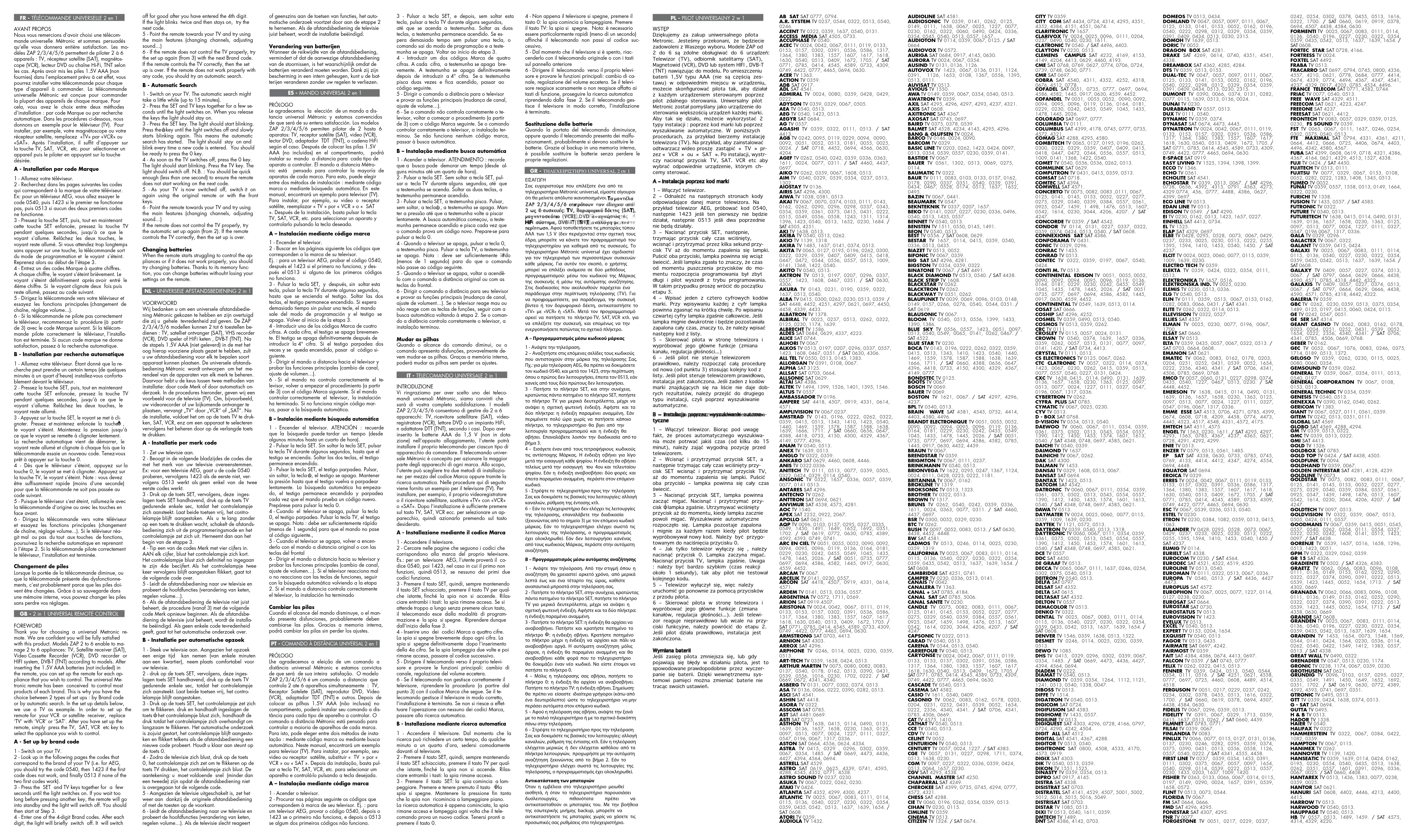 FR - TÉLÉCOMMANDE UNIVERSELLE 2 en 1 IT - TELECOMANDO UNIVERSALE 2 in 1 PL - PILOT UNIWERSALNY 2 w 1 GR - THLECEIRISTHRIO UNIVERSAL 2 σε 1 AVANT PROPOS Nous vous remercions d’avoir choisi une télécom- mande universelle Métronic et sommes persuadés qu’elle vous donnera entière satisfaction. Les mo- dèles ZAP 2/3/4/5/6 permettent de piloter 2 à 6 appareils : TV, récepteur satellite (SAT), magnétos- cope (VCR), lecteur DVD ou chaîne Hi-Fi, TNT selon les cas. Après avoir mis les piles 1.5V AAA (non fournies) dans l’emplacement prévu à cet effet, vous pourrez installer votre télécommande pour chaque type d’appareil à commander. La télécommande universelle Métronic est conçue pour commander la plupart des appareils de chaque marque. Pour cela, vous avez le choix entre deux méthodes d’installation : par code Marque ou par recherche automatique. Dans les procédures ci-dessous, nous donnons un exemple pour le téléviseur (TV). Pour installer, par exemple, votre magnétoscope ou votre récepteur satellite, remplacez «TV» par «VCR» ou «SAT». Après l’installation, il suffit d’appuyer sur la touche TV, SAT, VCR, etc. pour sélectionner un appareil puis le piloter en appuyant sur la touche désirée. A - Installation par code Marque