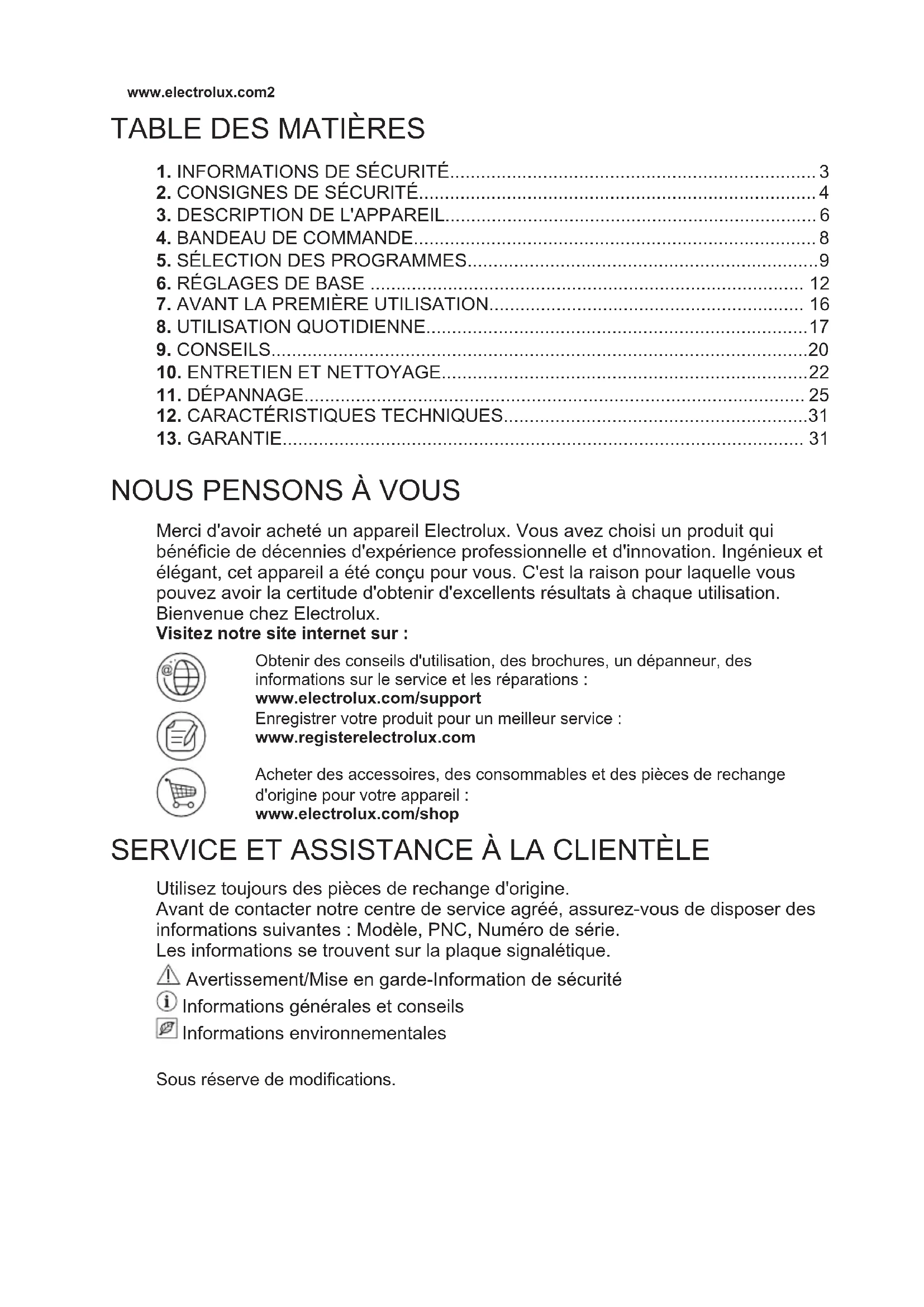 Merci d'avoir acheté un appareil Electrolux. Vous avez choisi un produit qui bénéficie de décennies d'expérience professionnelle et d'innovation. Ingénieux et élégant, cet appareil a été conçu pour vous. C'est la raison pour laquelle vous pouvez avoir la certitude d'obtenir d'excellents résultats à chaque utilisation. Bienvenue chez Electrolux. Visitez notre site internet sur : Obtenir des conseils d'utilisation, des brochures, un dépanneur, des informations sur le service et les réparations : www.electrolux.com/support Enregistrer votre produit pour un meilleur service : www.registerelectrolux.com Acheter des accessoires, des consommables et des pièces de rechange d'origine pour votre appareil : www.electrolux.com/shop