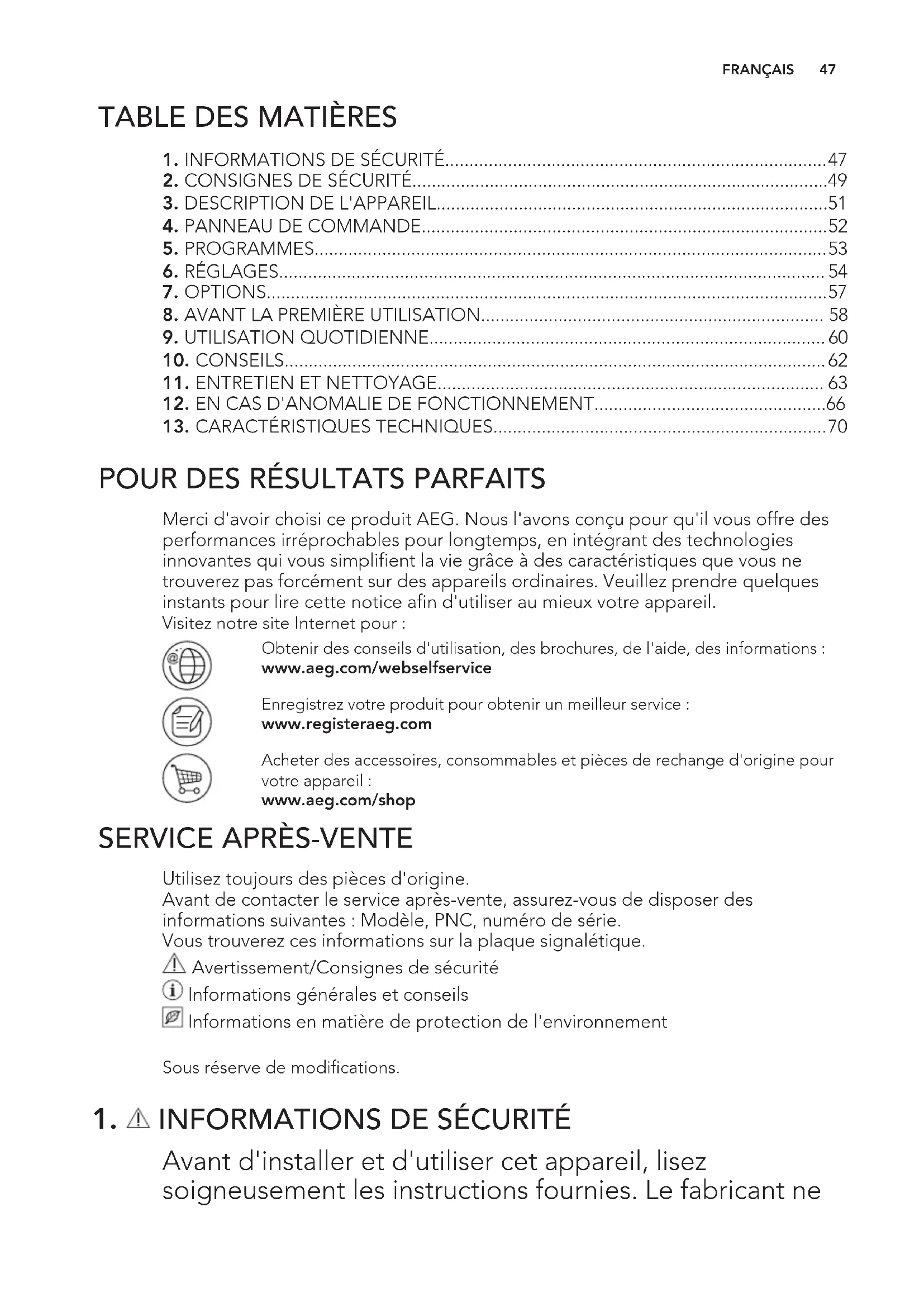 Merci d'avoir choisi ce produit AEG. Nous l'avons conçu pour qu'il vous offre des performances irréprochables pour longtemps, en intégrant des technologies innovantes qui vous simplifient la vie grâce à des caractéristiques que vous ne trouverez pas forcément sur des appareils ordinaires. Veuillez prendre quelques instants pour lire cette notice afin d'utiliser au mieux votre appareil. Visitez notre site Internet pour : Obtenir des conseils d'utilisation, des brochures, de l'aide, des informations : www.aeg.com/webselfservice Enregistrez votre produit pour obtenir un meilleur service : www.registeraeg.com Acheter des accessoires, consommables et pièces de rechange d'origine pour votre appareil : www.aeg.com/shop