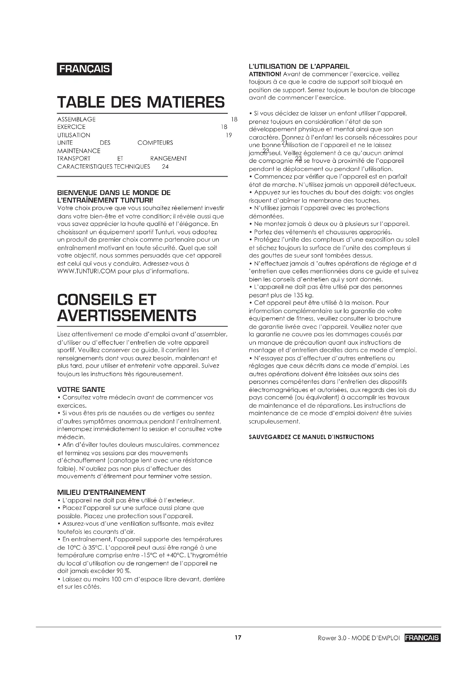 L’ENTRAÎNEMENT TUNTURI! Votre choix prouve que vous souhaitez réellement investir dans votre bien-être et votre condition; il révèle aussi que vous savez apprécier la haute qualité et l’élégance. En choisissant un équipement sportif Tunturi, vous adoptez un produit de premier choix comme partenaire pour un entraînement motivant en toute sécurité. Quel que soit votre objectif, nous sommes persuadés que cet appareil est celui qui vous y conduira. Adressez-vous à WWW.TUNTURI.COM pour plus d’informations. CONSEILS ET AVERTISSEMENTS Lisez attentivement ce mode d’emploi avant d’assembler, d’utiliser ou d’effectuer l’entretien de votre appareil sportif. Veuillez conserver ce guide, il contient les renseignements dont vous aurez besoin, maintenant et plus tard, pour utiliser et entretenir votre appareil. Suivez toujours les instructions très rigoureusement. VOTRE SANTE