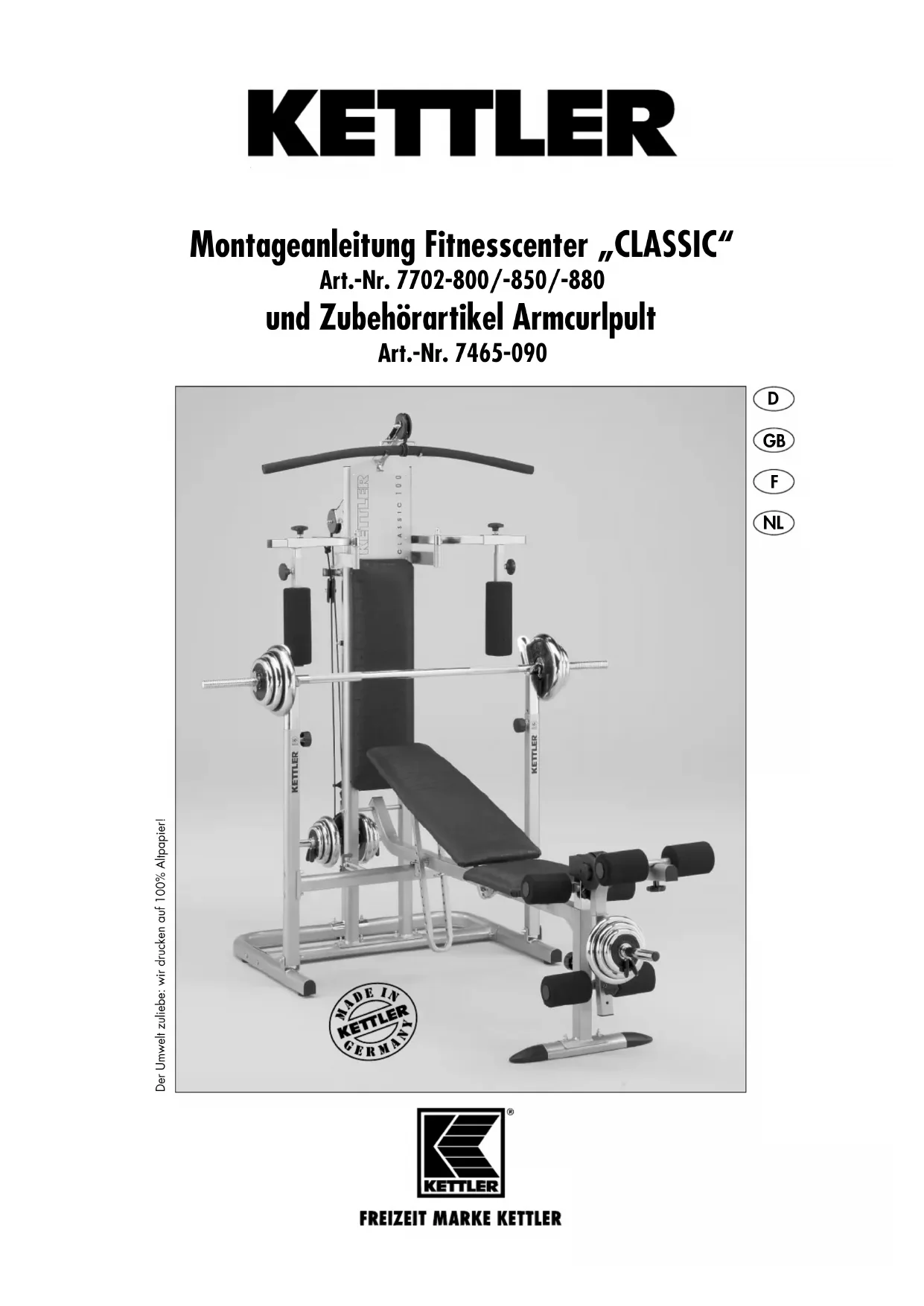Before assembling or using the Fitness Center „CLASSIC“, please read the following instructions carefully. They contain important information for use and maintenance of the equipment as well as for your personal safety. Keep these instruc- tions in a safe place for maintenance purposes or for ordering spare parts. Handling the equipment ■ Before using the equipment for exercise, check carefully to ensu- re that it has been correctly assembled. ■ During exercise, ensure that all the necessary safety elements are in place and that they cannot work loose. Before use, always check all screws and plug-in connections as well as res- pective safety devices fit correctly. ■ Do not set the equipment up in rooms which are frequently used or close to doors, entries etc. ■ It is not recommended to use or store the apparatus in a damp room as this may cause it to rust. Please ensure that no part of the machine comes in contact with liquids (drinks, perspiration etc.). This may cause corrosion. ■ The surface on which the unit is placed must be firm and even. Place rubber or straw mats under it to deaden any noise or impacts. Do not allow the weights to drop from a height. ■ The unit is designed for use by adults and children should not be allowed to play with it. Children at play behave unpredictably and dangerous situations may occur for which the manufacturer cannot be held liable. If, in spite of this, children are allowed to use the equipment, ensure that they are instructed in its proper use and supervised accordingly. ■ Do not use corrosive or abrasive materials to clean the equip- ment. Ensure that such materials are not allowed to pollute the environment. ■ Please keep original packaging of this article, so that it may be used for transport at a later date, if necessary Instructions for Assembly ■ Ensure that you have received all the parts required (see check list page 7) and that they are undamaged. Should you have any cause for complaint, please contact your KETTLER dealer. ■ Please note that there is always a danger of injury when wor- king with tools or doing manual work. Therefore please be careful when assembling this machine. ■ Ensure that your working area is free of possible sources of dan- ger, for example don’t leave any tools lying around. Always dispose packaging material in such a way that it may not cause any danger. There is always a risk of suffocation if children play with plastic bags! ■ Before assembling the equipment, study the drawings carefully and carry out the operations in the order shown by the dia- grams. The correct sequence is given in capital letters. ■ The fastening material required for each assembly step is shown in the diagram inset. Use the fastening material exactly as instructed. The required tools are supplied with the equipment. ■ Bolt all the parts together loosely at first, and check that they have been assembled correctly. Tighten the locknuts by hand until resistance is felt, then use spanner to finally tighten nuts completely against resistance (locking device). Then check that all screw connections have been tightened firmly. Attention: once locknuts have been unscrewed they no longer function cor- rectly (the locking device is destroyed), and must be replaced. ■ The equipment must be assembled with due care by an adult person. If in doubt call upon the help of a second person, if pos- sible technically talented. ■ For technical reasons, we reserve the right to carry out prelimi- nary assembly work (e.g. addition of tubing plugs). ■ Ensure that the ropes are correctly and firmly knotted. This applies especially to the shoulder bar. List of spare parts page 16 - 18 When ordering spare parts, always state the full article number, spare-part number, the quantity required and the inspection num- ber stamped on the back. Example order: Art. no. 7702-800 / spare-part no. 10100081 / 2 pieces / inspection no...... Important: spare part prices do not include fastening material; if fastening material (bolts, nuts, washers etc.) is required, this should be clearly stated on the order by adding the words „with fasten- ing material“. KETTLER GB Ltd. · Kettler House, Merse Road · North Moons Moat · Redditch, Worcestershire B98 9HL KETTLER International Inc. · 1355, London Bridge Road · USA-Virginia Beach, Virginia 23450 www.kettler.net5 Pour votre sécurité ■ L'appareil ne doit être utilisée que pour les fins auxquelles elle est destinée, c'est-à-dire pour l'entraînement des adultes. ■ Tout autre emploi est interdit, voire dangereux. Le fabricant ne pourra être rendu responsable de dommages causés par l'em- ploi inadéquat de l'appareil. ■ Vous vous entraînez avec un appareil dont la technique et la sécurité correspondent aux exigences modernes. Les sources possibles de danger qui pourraient entraîner des blessures ont été soit supprimées, soit sécurisées. ■ L´appareil est conforme à la classe H de la norme EN 957. ■ Les réparations inadéquates et les modifications apportées à la construction de l'appareil (démontage des pièces d'origine, montage de pièces non autorisées, etc.) peuvent entraîner des risques imprévus pour l'utilisateur. ■ Touts manipulation/modification á l’appareil peut provoquer des dommage ou représenter un danger de la personne. Des modifications ne peuvent être apportées que par du personnel qualifié formé par la Ste. KETTLER. ■ Les composants endommagés peuvent affecter votre sécurité et la durée de vie de l'appareil. On remplacera donc sans tarder les composants usés ou endommagés et on interdira l'emploi de l'appareil aussi longtemps qu'ils n'auront pas été remplacés. N'utiliser que des pièces de rechange KETTLER d'origine. ■ On cas de doute, on est prié de s'adresser à son conces- sionnaire KETTLER. ■ En cas d'entraînement régulier et intensif, il y a lieu de contrôler, tous les mois ou tous les 2 mois, toutes les pièc