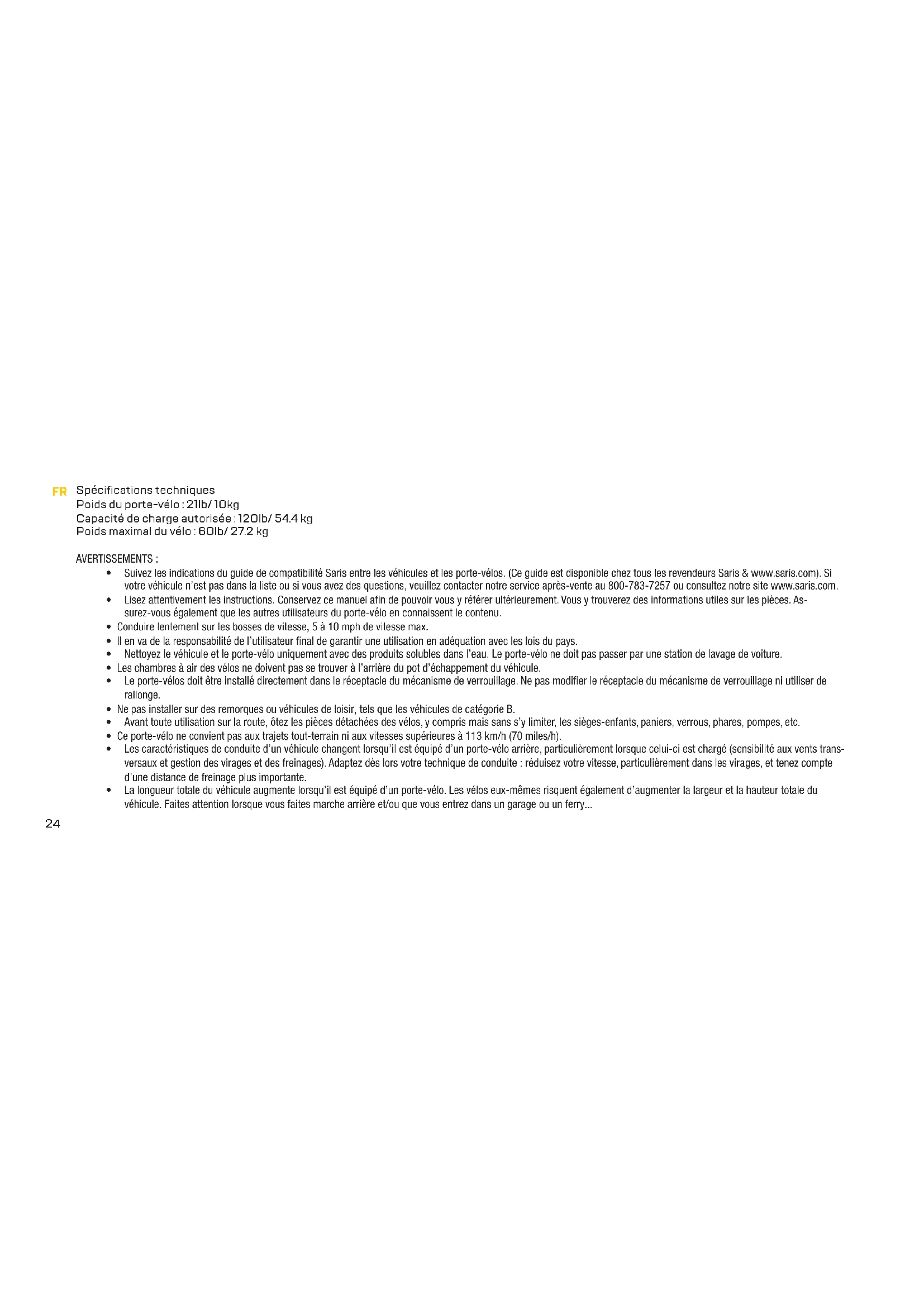- Saris ne pourra en aucun cas être tenu responsable des blessures personnelles ou dommages indirects à des biens ou possessions, résultant d'une installation ou d'une utilisation incorrecte.