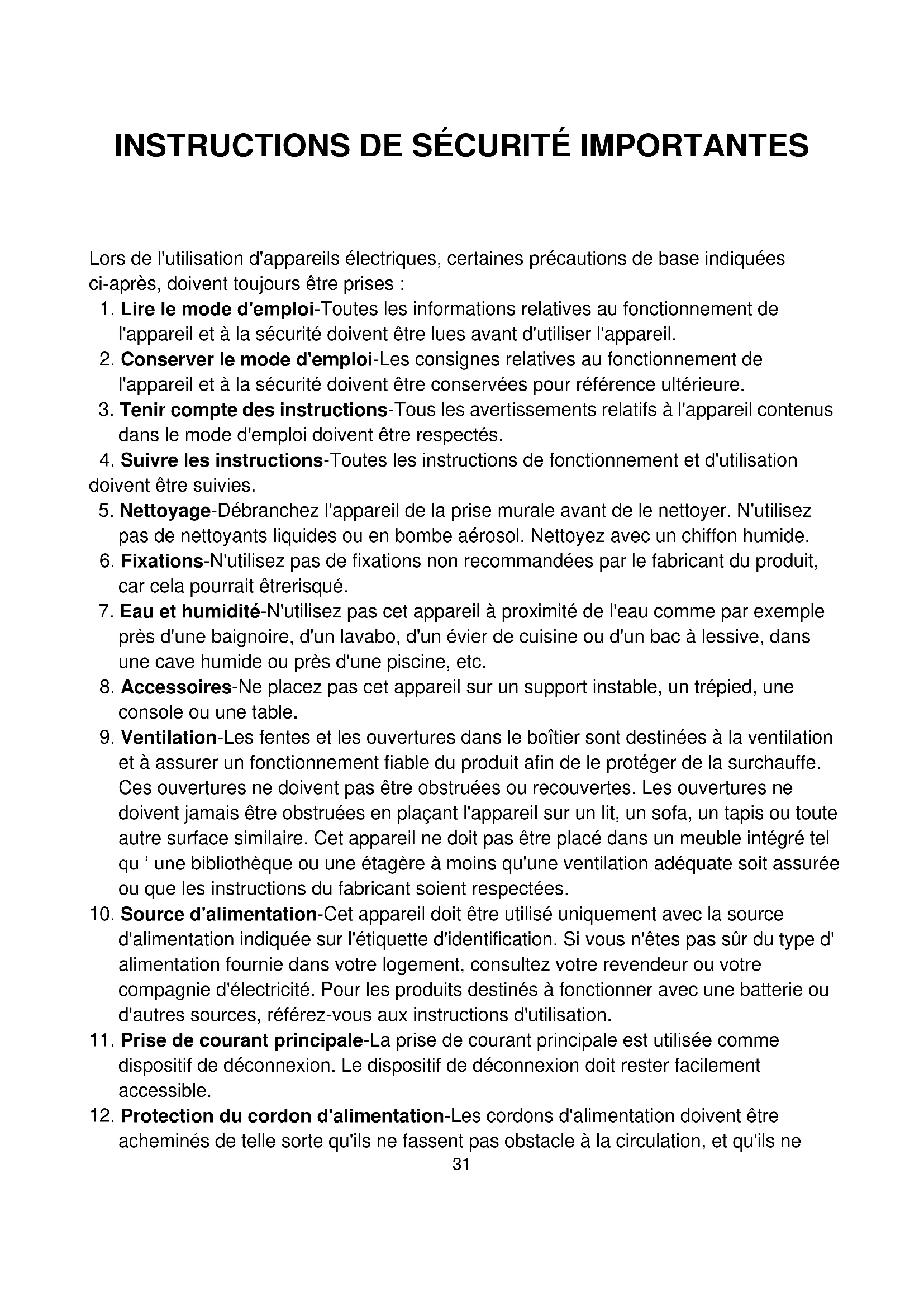 - Conserver le mode d'emploi-Les consignes relatives au fonctionnement de l'appareil et à la sécurité doivent être conservées pour référence ultérieure.