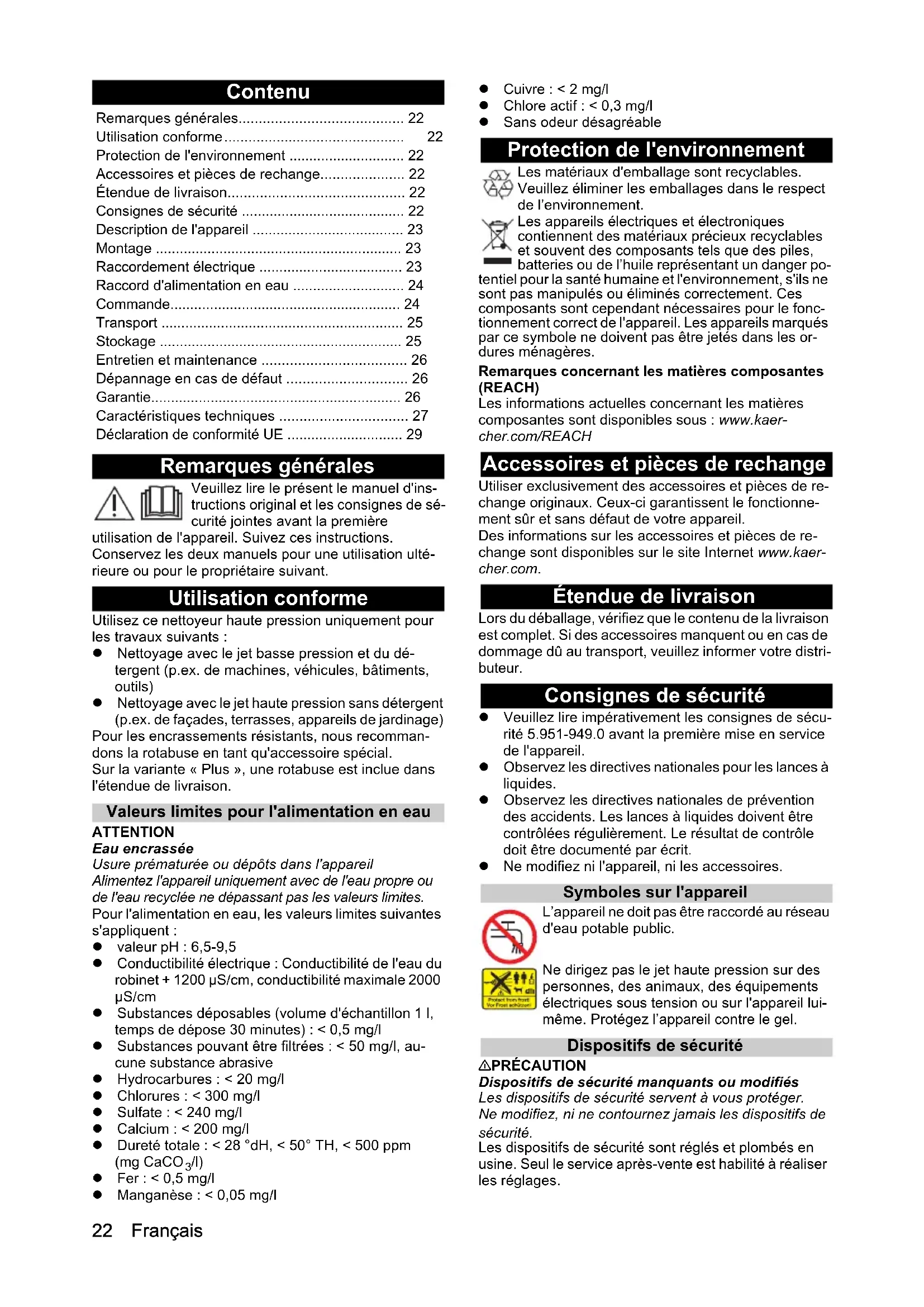 - /l) Fer : < 0,5 mg/l Manganèse : < 0,05 mg/l Cuivre : < 2 mg/l Chlore actif : < 0,3 mg/l Sans odeur désagréable Protection de l'environnement Les matériaux d'emballage sont recyclables. Veuillez éliminer les emballages dans le respect de l’environnement. Les appareils électriques et électroniques contiennent des matériaux précieux recyclables et souvent des composants tels que des piles, batteries ou de l’huile représentant un danger po- tentiel pour la santé humaine et l'environnement, s'ils ne sont pas manipulés ou éliminés correctement. Ces composants sont cependant nécessaires pour le fonc- tionnement correct de l'appareil. Les appareils marqués par ce symbole ne doivent pas être jetés dans les or- dures ménagères. Remarques concernant les matières composantes (REACH) Les informations actuelles concernant les matières composantes sont disponibles sous : www.kaer- cher.com/REACH Accessoires et pièces de rechange Utiliser exclusivement des accessoires et pièces de re- change originaux. Ceux-ci garantissent le fonctionne- ment sûr et sans défaut de votre appareil. Des informations sur les accessoires et pièces de re- change sont disponibles sur le site Internet www.kaer- cher.com. Étendue de livraison Lors du déballage, vérifiez que le contenu de la livraison est complet. Si des accessoires manquent ou en cas de dommage dû au transport, veuillez informer votre distri- buteur. Consignes de sécurité Veuillez lire impérativement les consignes de sécu- rité 5.951-949.0 avant la première mise en service de l'appareil. Observez les directives nationales pour les lances à liquides. Observez les directives nationales de prévention des accidents. Les lances à liquides doivent être contrôlées régulièrement. Le résultat de contrôle doit être documenté par écrit. Ne modifiez ni l'appareil, ni les accessoires. Symboles sur l'appareil L’appareil ne doit pas être raccordé au réseau d'eau potable public. Ne dirigez pas le jet haute pression sur des personnes, des animaux, des équipements électriques sous tension ou sur l'appareil lui- même. Protégez l’appareil contre le gel. Dispositifs de sécurité 몇 PRÉCAUTION Dispositifs de sécurité manquants ou modifiés Les dispositifs de sécurité servent à vous protéger. Ne modifiez, ni ne contournez jamais les dispositifs de sécurité. Les dispositifs de sécurité sont réglés et plombés en usine. Seul le service après-vente est habilité à réaliser les réglages. Remarques générales p. 22