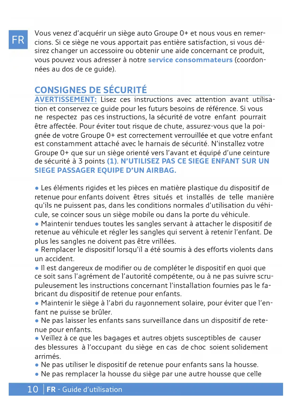 FR - Guide d’utilisation Vous venez d’acquérir un siège auto Groupe 0+ et nous vous en remer- cions. Si ce siège ne vous apportait pas entière satisfaction, si vous dé- sirez changer un accessoire ou obtenir une aide concernant ce produit, vous pouvez vous adresser à notre service consommateurs (coordon- nées au dos de ce guide).