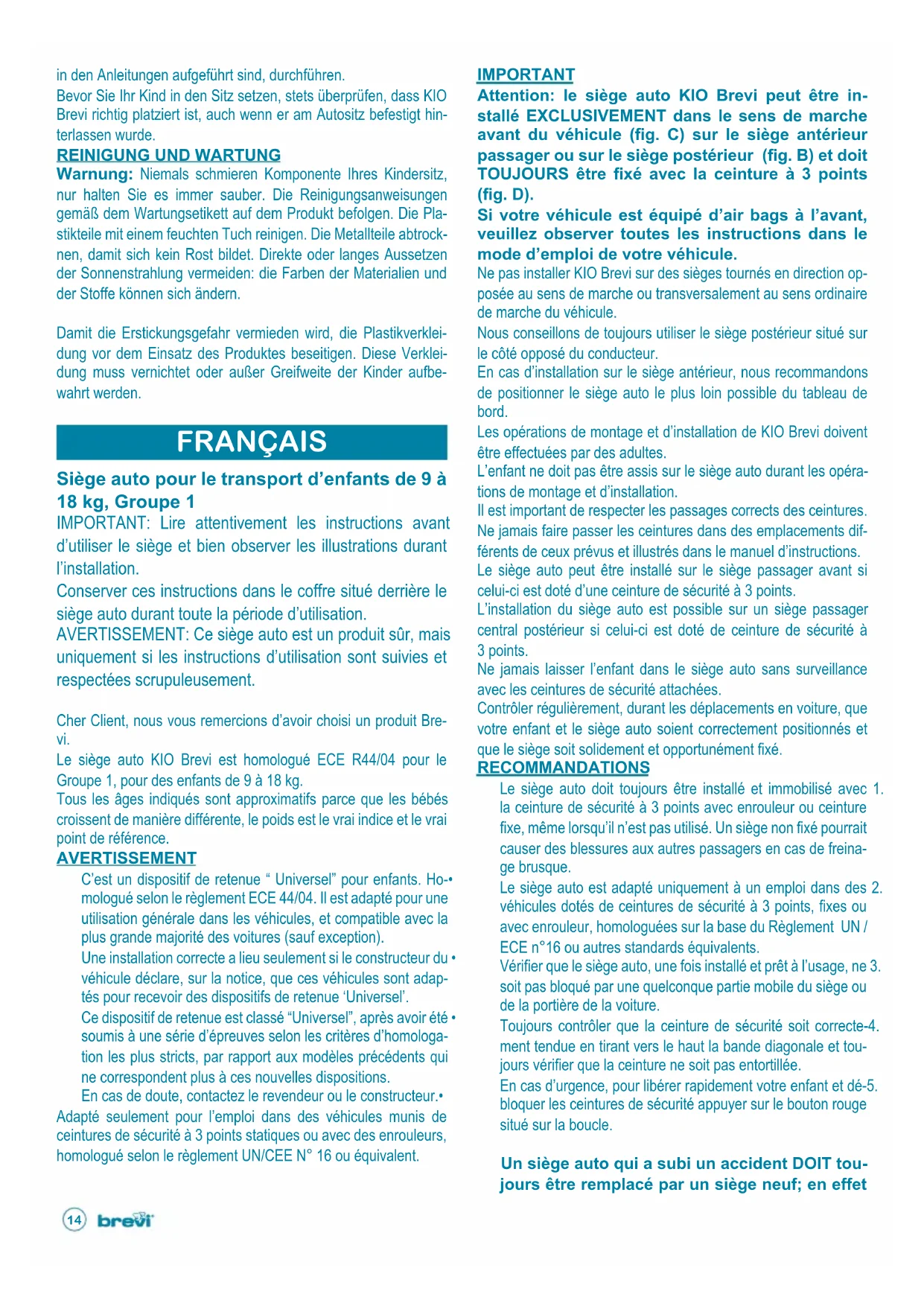 Warnung: Niemals schmieren Komponente Ihres Kindersitz, nur halten Sie es immer sauber. Die Reinigungsanweisungen gemäß dem Wartungsetikett auf dem Produkt befolgen. Die Pla- stikteile mit einem feuchten Tuch reinigen. Die Metallteile abtrock- nen, damit sich kein Rost bildet. Direkte oder langes Aussetzen der Sonnenstrahlung vermeiden: die Farben der Materialien und der Stoffe können sich ändern. Damit die Erstickungsgefahr vermieden wird, die Plastikverklei- dung vor dem Einsatz des Produktes beseitigen. Diese Verklei- dung muss vernichtet oder außer Greifweite der Kinder aufbe- wahrt werden.15 même s’il ne montre pas de signes évidents d’endommagement, il pourrait avoir subi des chocs qui ont modifié les conditions nécessai- res garantissant la sécurité la plus complète en cas d’un accident successif et est donc dange- reux pour votre enfant. Pour la plus grande sécurité et protection de votre enfant, 6. ne pas utiliser ni acquérir de siège auto d’occasion. Aucune modification, ni ajout de pièces supplémentaires ne peuvent être apportés au siège auto sans l’approbation préalable spé- cifique du revendeur. Ne pas laisser le siège auto exposé au soleil afin d’éviter que 7. l’enfant ne se brûle. Ne pas laisser le siège dans la voiture ex- posée au soleil: les parties en plastique pourraient chauffer. Tenir bien fixés tous les objets dans la voiture. Ceux-ci doivent 8. être correctement immobilisés car en cas de freinage brusque les objets libres, en se déplaçant, pourraient causer de sérieu- ses blessures. Les ceintures de sécurité du siège auto ne doivent pas être 9. utilisées sans les bandoulières. Ne pas utiliser le siège auto sans son revêtement textile et ne pas le remplacer par un au- tre non recommandé par la société Brevi srl ou par le reven- deur, car il détermine le fonctionnement correct du dispositif de retenue. Pour tout problème d’utilisation ou d’installation, ne pas uti-10. liser le siège auto et contacter le fabricant (Brevi srl) ou le revendeur. Toujours mettre l’enfant dans le siège auto, même lors de 11. trajets de quelques mètres seulement. Toujours attacher l’en- fant avec les ceintures de sécurité même lorsque l’on utilise le siège hors de la voiture. Ne pas utiliser le produit si certaines de ses parties sont cas-12. sées ou manquantes. Tous les passagers doivent être informés des procédures de 13. détachement de l’enfant en cas d’accident. Ce siège auto n’a pas été conçu pour y faire dormir l’enfant 14. de manière prolongée. Lorsque l’enfant a besoin de dormir, il convient de le placer dans un couffin ou un lit approprié. L’utilisation d’accessoires non approuvés par la société Brevi srl ou par le revendeur peut se révéler dangereuse. CONTROLES FINAUX Vérifier que la position de la ceinture de sécurité du véhicule 1. autour du siège auto soit correcte. Toujours vérifier que la ceinture de sécurité du véhicule ne soit 2. pas encastrée ou entortillée. Vérifier que la ceinture de sécurité du véhicule soit bien ten-3. due et que le siège auto KIO Brevi soit correctement immobi- lisé au siège du véhicule. Vérifiez régulièrement qu’aucun élément important ait subi 4. d’éventuels dommages. Vérifiez le bon fonctionnement de tous les composants.5. Vérifiez que le siège enfant ne soit pas coincé dans la portiè-6. re de la voiture, les coureurs du siège etc, afin d’éviter bris, dommages, usure etc. Se rappeler que: Tout en étant conçu et homologué confor- mément aux réglementations européennes en vigueur, si le siège auto est installé de manière incorrecte, il peut ne pas assurer une protection adéquate à votre enfant en cas d’accident. Avant de démarrer le véhicule et d’utiliser le siège auto KIO Brevi, toujours effectuer les contrôles finaux énumérés dans ce livret d’instruc- tions. Avant d’asseoir l’enfant sur le siège auto, toujours contrôler que KIO Brevi soit correctement positionné et immobilisé même si le siège n’a pas été déplacé ou retiré du véhicule après une pré- cédente utilisation.