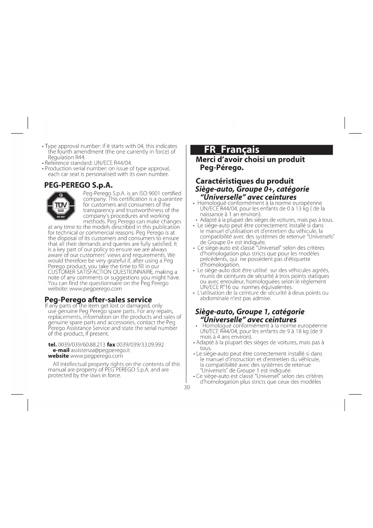 - Numéro progressif de fabrication : il est propre à chaque siège-auto ; lorsque l’homologation est délivrée, chaque produit est caractérisé par un numéro différent. PEG-PÉREGO S.p.A. La certification offre à la clientèle une garantie de transparence et représente un gage de confiance dans la façon de travailler de l’entreprise. Peg-Pérego se réserve le droit de procéder à tout moment à des modifications sur les modèles décrits dans cet ouvrage, pour des raisons de nature technique ou commerciale. Peg-Pérego est à la disposition de sa clientèle pour satisfaire au mieux chacune de ses exigences. En cela, il est très important et précieux pour nous de connaître l’opinion de notre clientèle. Nous vous saurions donc gré, après avoir utilisé un de nos produits, de remplir le QUESTIONNAIRE DE SATISFACTION CLIENT, en nous faisant part de toute observation ou suggestion éventuelle. Vous trouverez ce questionnaire sur notre site Internet, à l'adresse www.pegperego.com Service d’assistance Peg-Pérego En cas de perte de pièces ou de rupture de l’une d’elles, utiliser exclusivement des pièces de rechange originales Peg-Pérego. Pour toute réparation, remplacement, informations sur les produits, vente de pièces détachées d’origine et accessoires, contacter le service après-vente Peg Pérego en indiquant, si présent, le numéro de série du produit. tél. 0039/039/60.88.213 fax 0039/039/33.09.992 e-mail assistenza@pegperego.it site Internet www.pegperego.com Tous les droits de propriété intellectuelle relatifs au contenu de ce manuel appartiennent à PEG PEREGO SpA et sont protégés par la loi.36 auf der Grundlage strengerer Zulassungskriterien als bei den Vorgängermodellen, die nicht über diese Zulassung verfügen. WICHTIG