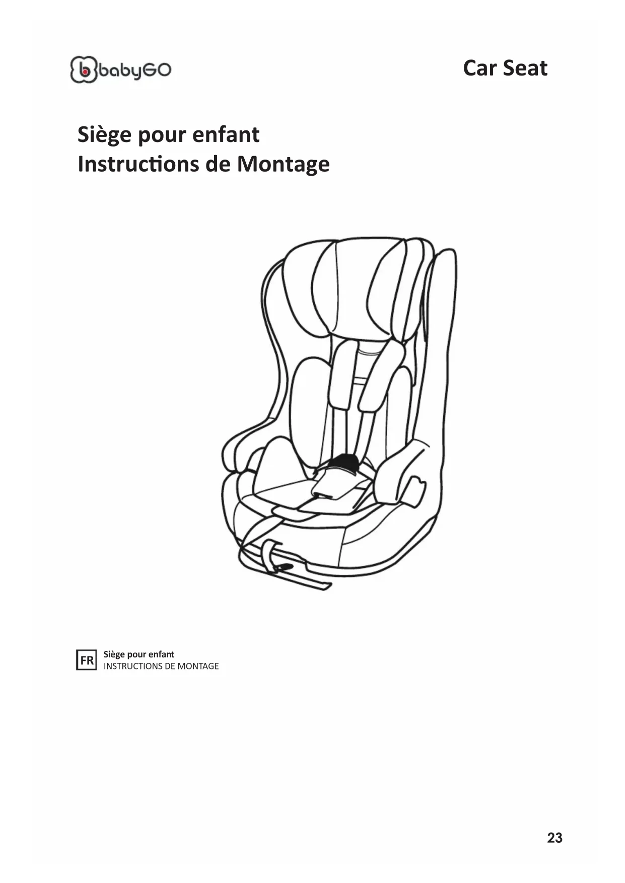 Merci d'avoir choisi le siège enfant BabyGO pour protéger votre enfant. Ce dispositif de retenue pour enfant a été homologué conformément à la norme ECE-R44/04 et fabriqué dans le cadre d'un strict programme de contrôle qualité. Veuillez suivre toutes les consignes figurant sur l'étiquette de cette retenue pour enfant ainsi que dans les instructions imprimées avant de l'installer et de l'utiliser. Le manquement au respect de toutes les consignes peut entraîner la mort ou de graves lésions en cas d'accident.