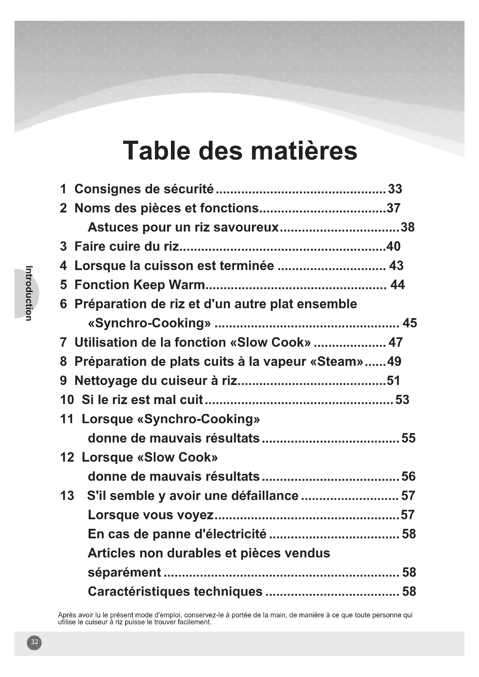 - Toute réparation doit être effectuée par un réparateur autorisé. Ce cuiseur à riz est destinée à l’utilisation ménagère. Le cordon d’alimentation court fourni est destiné à réduire tout risque de se prendre les pieds et de chute avec un cordon plus long. Un cordon plus long détachable ou une rallonge sont disponibles et peuvent être utilisés avec une grande précaution. Dans le cas d'utilisation de ce genre de cordon : (1) La puissance nominale électrique marquée sur le cordon d’ extension doit être au moins égale à celle de l’appareil; (2) si l’appareil est avec mise à la terre, la rallonge doit être munie d’une prise de terre à 3 fils; et (3) le cordon doit être rangé pour ne pas pendre au dessus de la table et pouvoir être tiré par des enfants ou accroché accidentellement. Les instructions suivantes sont applicables à 120V seulement : Cet appareil possède une fiche polarisée (avec une broche plus large qu’une autre). Pour réduire tout risque d’électrocution, cette fiche se branche dans une prise polarisée d’une seule manière. Si la fiche ne rentre pas entièrement dans la prise, la tourner. Si elle ne branche toujours pas, contacter un électricien qualifié. Ne pas forcer cette fonction de sécurité. Cet appareil n’est pas destiné à être utilisé par des enfants ou des personnes handicapées sans supervision. Faire attention que les enfants ne jouent pas avec le cuiseur à riz.4 Introduction Contents 1 Safety instructions p. 5