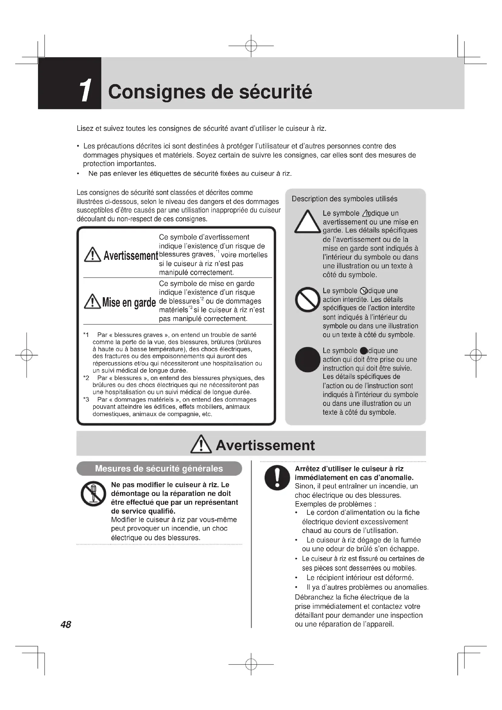 - Les précautions décrites ici sont destinées à protéger l’utilisateur et d’autres personnes contre des dommagesphysiquesetmatériels.Soyezcertaindesuivrelesconsignes,carellessontdesmesuresdeprotection importantes.• Nepasenleverlesétiquettesdesécuritéxéesaucuiseuràriz.Les consignes de sécurité sont classées et décrites comme illustréesci-dessous,selonleniveaudesdangersetdesdommagessusceptibles d’être causés par une utilisation inappropriée du cuiseur découlant du non-respect de ces consignes.Mesures de sécurité généralesNe pas modier le cuiseur à riz. Le démontage ou la réparation ne doit être effectué que par un représentant de service qualié.Modierlecuiseuràrizparvous-mêmepeutprovoquerunincendie,unchocélectrique ou des blessures.Arrêtez d’utiliser le cuiseur à riz immédiatement en cas d’anomalie.Sinon,ilpeutentraînerunincendie,unchoc électrique ou des blessures.Exemples de problèmes :• Lecordond’alimentationoulacheélectrique devient excessivement chaud au cours de l’utilisation.• Le cuiseur à riz dégage de la fumée ou une odeur de brûlé s’en échappe. Lecuiseuràrizestssuréoucertainesdeses pièces sont desserrées ou mobiles.• Le récipient intérieur est déformé.• Il ya d’autres problèmes ou anomalies.Débranchezlacheélectriquedelaprise immédiatement et contactez votre détaillant pour demander une inspection ou une réparation de l’appareil. Avertissement Ce symbole d’avertissement indique l’existence d’un risque de blessuresgraves, voire mortelles si le cuiseur à riz n’est pas manipulé correctement. Mise en garde Ce symbole de mise en garde indique l’existence d’un risque de blessures ou de dommages matériels si le cuiseur à riz n’est pas manipulé correctement.*1 Par«blessuresgraves»,onentenduntroubledesantécommelapertedelavue,desblessures,brûlures(brûluresàhauteouàbassetempérature),deschocsélectriques,des fractures ou des empoisonnements qui auront des répercussions et/ou qui nécessiteront une hospitalisation ou un suivi médical de longue durée.*2 Par«blessures»,onentenddesblessuresphysiques,desbrûlures ou des chocs électriques qui ne nécessiteront pas une hospitalisation ou un suivi médical de longue durée.*3 Par«dommagesmatériels»,onentenddesdommagespouvantatteindrelesédices,effetsmobiliers,animauxdomestiques,animauxdecompagnie,etc.Description des symboles utilisésLe symbole indique un avertissement ou une mise en garde.Lesdétailsspéciquesde l’avertissement ou de la mise en garde sont indiqués à l’intérieur du symbole ou dans une illustration ou un texte à côté du symbole.Le symbole indique une action interdite. Les détails spéciquesdel’actioninterditesont indiqués à l’intérieur du symbole ou dans une illustration ou un texte à côté du symbole.Le symbole indique une action qui doit être prise ou une instruction qui doit être suivie. Lesdétailsspéciquesdel’action ou de l’instruction sont indiqués à l’intérieur du symbole ou dans une illustration ou un texte à côté du symbole. Avertissement49 Français Avertissement Qui devrait utiliser le cuiseur à riz Ne pas permettre aux enfants d’utiliser le cuiseur à riz sans surveillance. Garder hors de la portée des jeunes enfants. L’usage sans supervision par des enfants ou des bébés de cet appareil peutentraînerdesbrûlures,deschocs électriques ou des blessures. Ce cuiseur à riz n’est pas destiné à être utilisé par des personnes ayant des difcultés physiques ou qui n’ont pas assez de connaissance sur sa bonne utilisation. Une personne ayant une connaissance sufsante de son mode d’emploi doit toujours être présente pour vérier que le cuiseur à riz est utilisé de la bonne façon. L’usageinappropriépeutentraînerdes brûlures,deschocsélectriquesoudes blessures. Utiliser le cuiseur à riz N’utilisez pas ce cuiseur à riz pour d’autres usages que ceux indiqués dans ce mode d’emploi (et le « COOKBOOK » fourni). Celapourraitentraînerdesbrûluresou blessures provoquées par le jaillissement de vapeur ou de contenu du cuiseur à riz. Exemples de choses à ne pas faire :