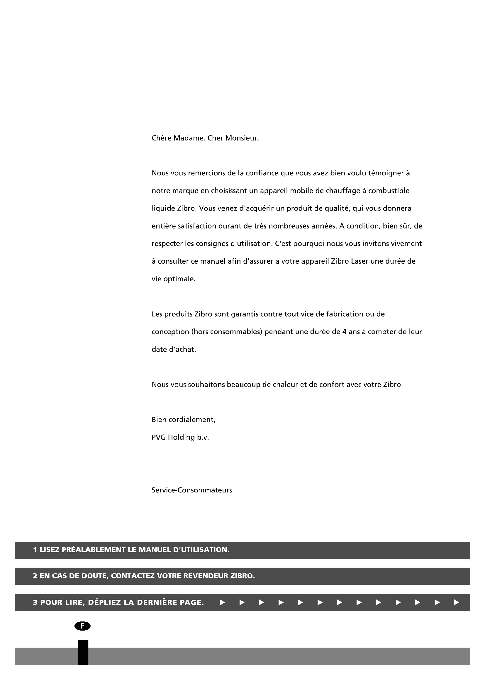 UTVIKNINGSSIDA FIN Chère Madame, Cher Monsieur, Nous vous remercions de la confiance que vous avez bien voulu témoigner à notre marque en choisissant un appareil mobile de chauffage à combustible liquide Zibro. Vous venez d'acquérir un produit de qualité, qui vous donnera entière satisfaction durant de très nombreuses années. A condition, bien sûr, de respecter les consignes d'utilisation. C'est pourquoi nous vous invitons vivement à consulter ce manuel afin d'assurer à votre appareil Zibro Laser une durée de vie optimale. Les produits Zibro sont garantis contre tout vice de fabrication ou de conception (hors consommables) pendant une durée de 4 ans à compter de leur date d'achat. Nous vous souhaitons beaucoup de chaleur et de confort avec votre Zibro. Bien cordialement, PVG Holding b.v. Service-Consommateurs 1 LISEZ PRÉALABLEMENT LE MANUEL D'UTILISATION. 2 EN CAS DE DOUTE, CONTACTEZ VOTRE REVENDEUR ZIBRO. 3 POUR LIRE, DÉPLIEZ LA DERNIÈRE PAGE. 3 POUR LIRE, DÉPLIEZ LA DERNIÈRE PAGE. 3L'UTILISATION