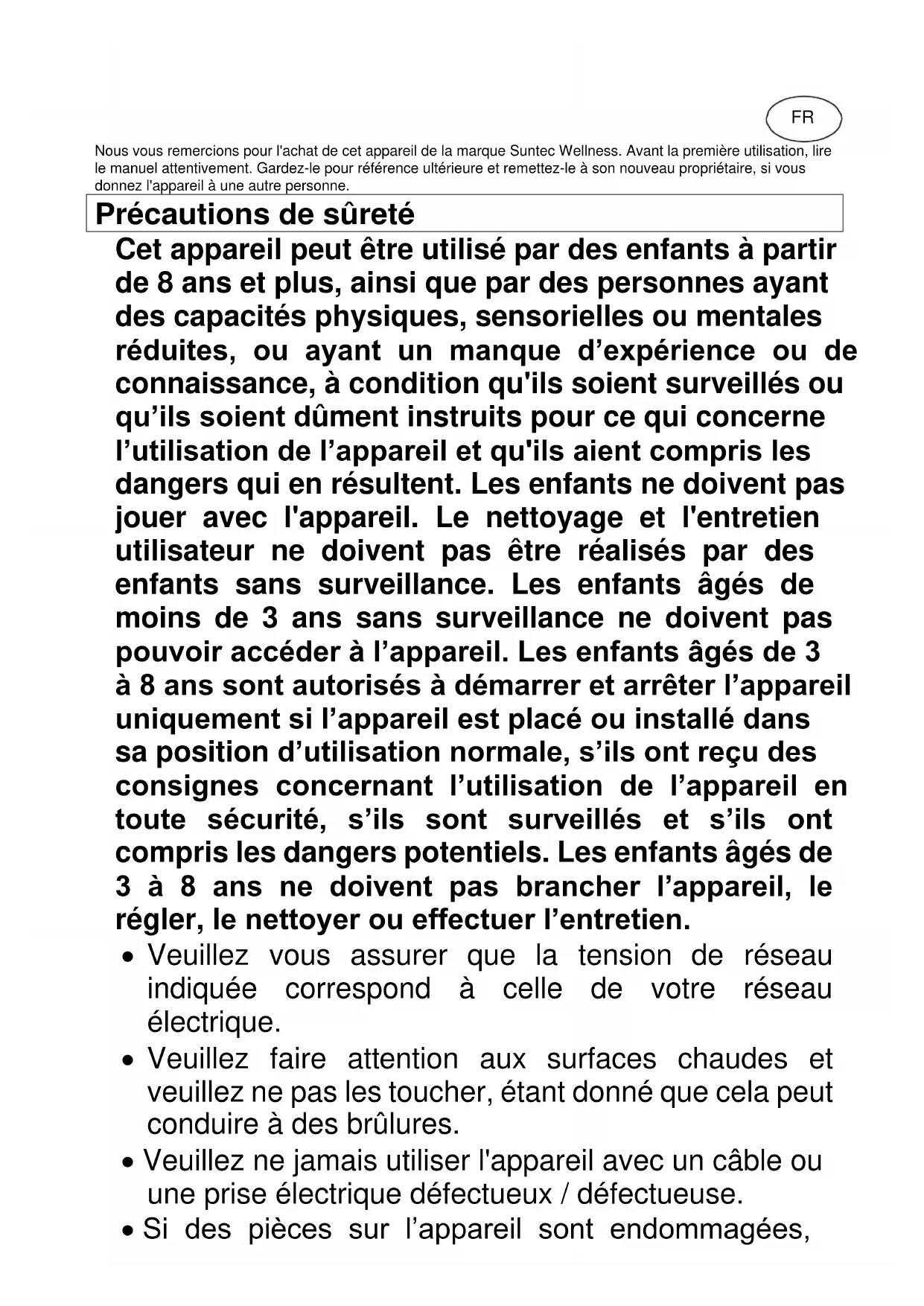 Heat Safe humid SUNTEC WELLNESS GMBH / HOLZSTRASSE 2 / 40221 DÜSSELDORF / GERMANYNous vous remercions pour l'achat de cet appareil de la marque Suntec Wellness. Avant la première utilisation, lire le manuel attentivement. Gardez-le pour référence ultérieure et remettez-le à son nouveau propriétaire, si vous donnez l'appareil à une autre personne. Précautions de sûreté Cet appareil peut être utilisé par des enfants à partir de 8 ans et plus, ainsi que par des personnes ayant des capacités physiques, sensorielles ou mentales réduites, ou ayant un manque d’expérience ou de connaissance, à condition qu'ils soient surveillés ou qu’ils soient dûment instruits pour ce qui concerne l’utilisation de l’appareil et qu'ils aient compris les dangers qui en résultent. Les enfants ne doivent pas jouer avec l'appareil. Le nettoyage et l'entretien utilisateur ne doivent pas être réalisés par des enfants sans surveillance. Les enfants âgés de moins de 3 ans sans surveillance ne doivent pas pouvoir accéder à l’appareil. Les enfants âgés de 3 à 8 ans sont autorisés à démarrer et arrêter l’appareil uniquement si l’appareil est placé ou installé dans sa position d’utilisation normale, s’ils ont reçu des consignes concernant l’utilisation de l’appareil en toute sécurité, s’ils sont surveillés et s’ils ont compris les dangers potentiels. Les enfants âgés de 3 à 8 ans ne doivent pas brancher l’appareil, le régler, le nettoyer ou effectuer l’entretien.