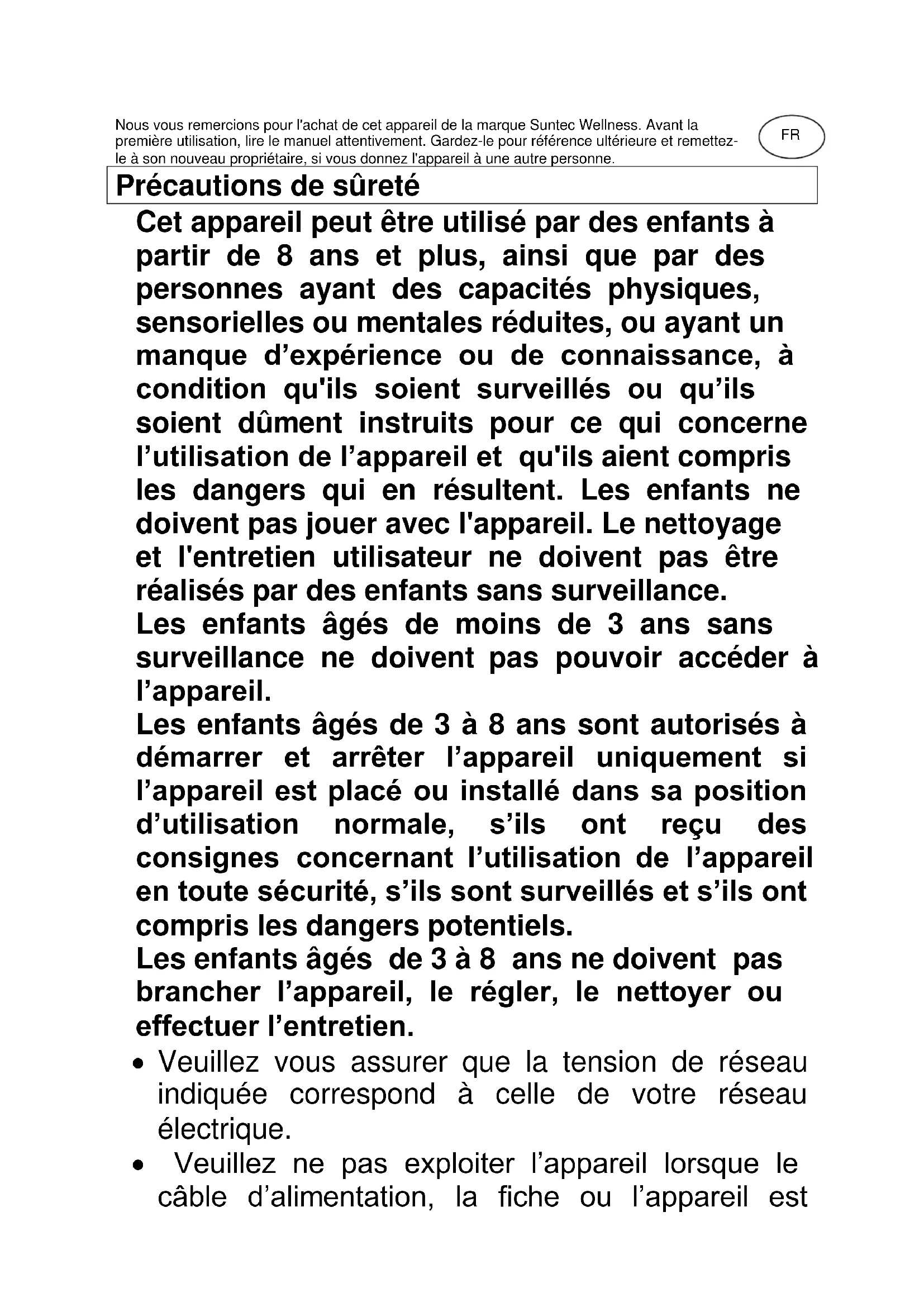 Heat Safe SUNTEC WELLNESS GMBH / HOLZSTRASSE 2 / 40221 DÜSSELDORF / GERMANY Para casos de reclamaciónFR Nous vous remercions pour l'achat de cet appareil de la marque Suntec Wellness. Avant la première utilisation, lire le manuel attentivement. Gardez-le pour référence ultérieure et remettez- le à son nouveau propriétaire, si vous donnez l'appareil à une autre personne. Précautions de sûreté Cet appareil peut être utilisé par des enfants à partir de 8 ans et plus, ainsi que par des personnes ayant des capacités physiques, sensorielles ou mentales réduites, ou ayant un manque d’expérience ou de connaissance, à condition qu'ils soient surveillés ou qu’ils soient dûment instruits pour ce qui concerne l’utilisation de l’appareil et qu'ils aient compris les dangers qui en résultent. Les enfants ne doivent pas jouer avec l'appareil. Le nettoyage et l'entretien utilisateur ne doivent pas être réalisés par des enfants sans surveillance. Les enfants âgés de moins de 3 ans sans surveillance ne doivent pas pouvoir accéder à l’appareil. Les enfants âgés de 3 à 8 ans sont autorisés à démarrer et arrêter l’appareil uniquement si l’appareil est placé ou installé dans sa position d’utilisation normale, s’ils ont reçu des consignes concernant l’utilisation de l’appareil en toute sécurité, s’ils sont surveillés et s’ils ont compris les dangers potentiels. Les enfants âgés de 3 à 8 ans ne doivent pas brancher l’appareil, le régler, le nettoyer ou effectuer l’entretien.