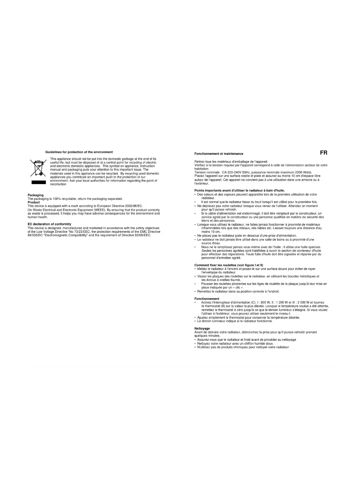 Retirez tous les matériaux d'emballage de l'appareil. Vérifiez si la tension requise par l'appareil correspond à celle de l'alimentation secteur de votre habitation. Tension nominale : CA 220-240V 50Hz, puissance nominale maximum 2000 Watts. Placez l'appareil sur une surface stable et plate et assurez au moins 10 cm d'espace libre autour de l'appareil. Cet appareil ne convient pas à une utilisation dans une armoire ou à l'extérieur. Points importants avant d'utiliser le radiateur à bain d'huile.