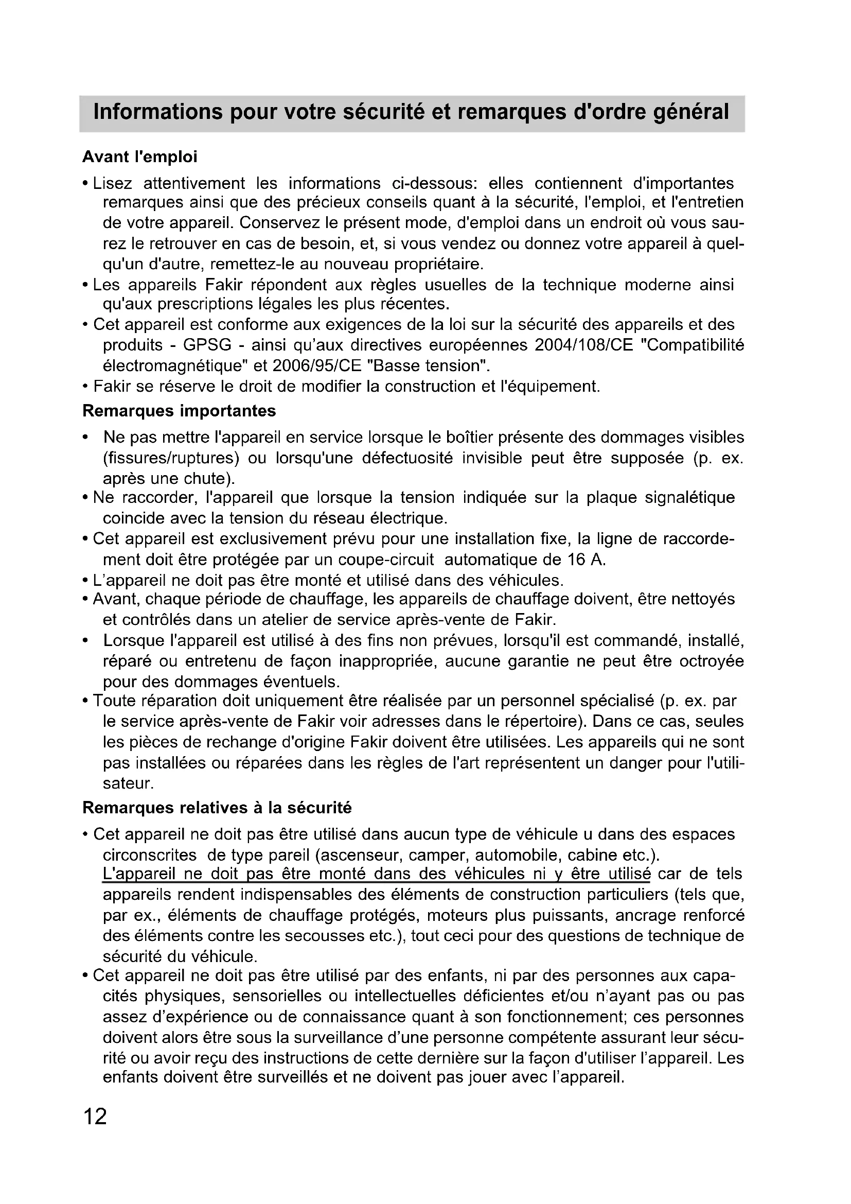 - Cet appareil ne doit pas être utilisé dans aucun type de véhicule u dans des espaces circonscrites de type pareil (ascenseur, camper, automobile, cabine etc.). L'appareil ne doit pas être monté dans des véhicules ni y être utilisé car de tels appareils rendent indispensables des éléments de construction particuliers (tels que, par ex., éléments de chauffage protégés, moteurs plus puissants, ancrage renforcé des éléments contre les secousses etc.), tout ceci pour des questions de technique de sécurité du véhicule.