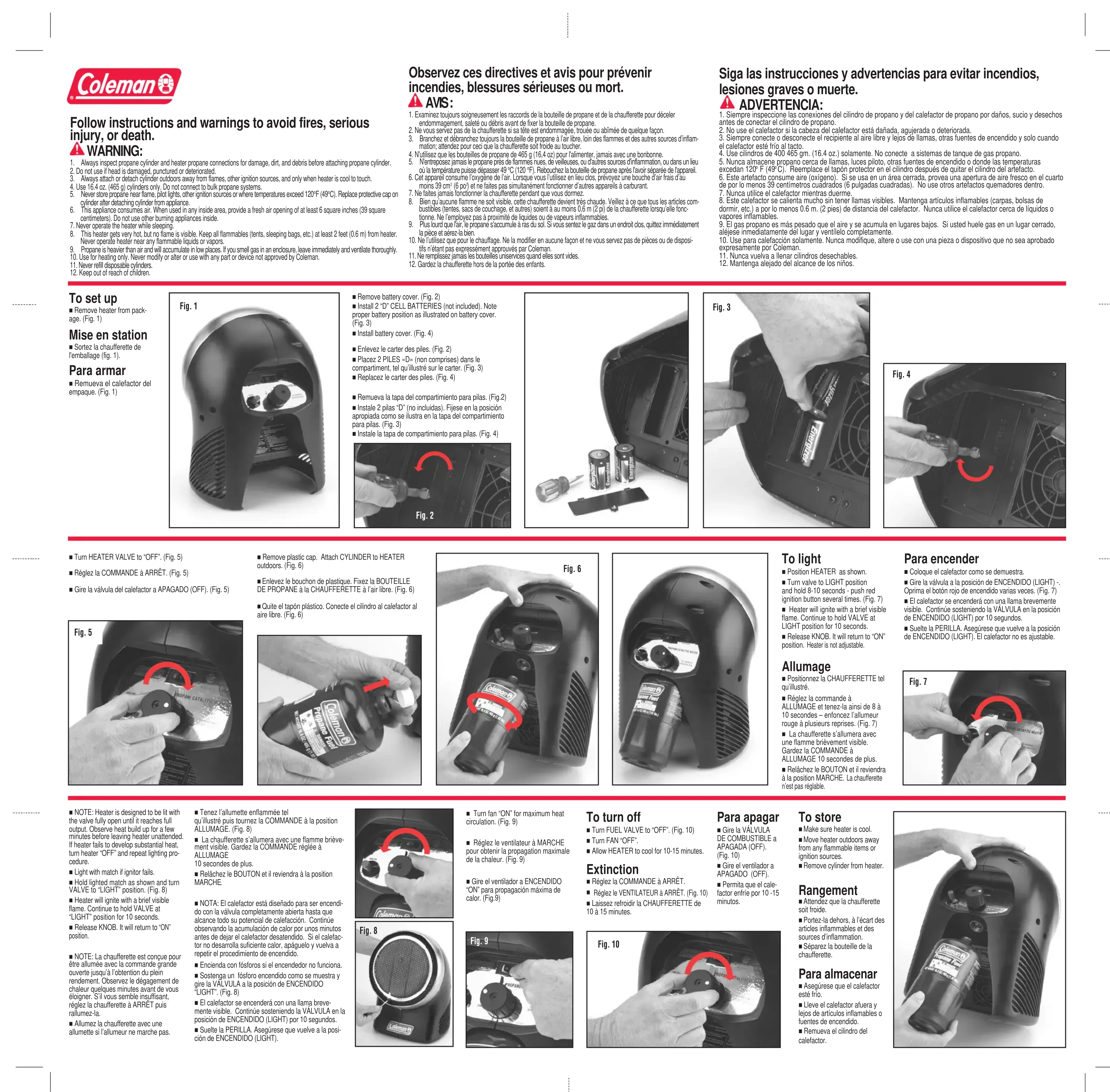 3. Branchez et débranchez toujours la bouteille de propane à l’air libre, loin des flammes et des autres sources d’inflam- mation; attendez pour ceci que la chaufferette soit froide au toucher.