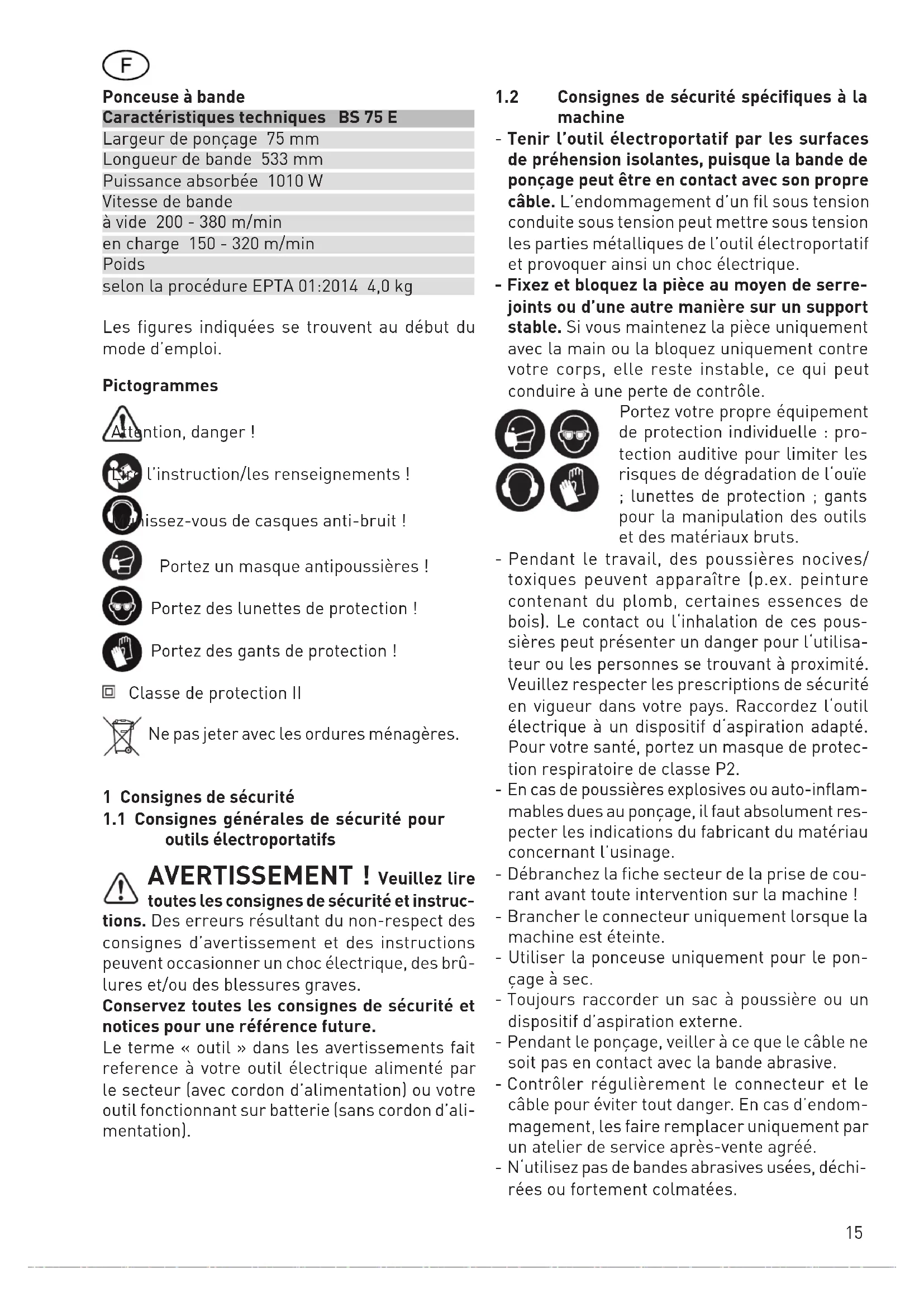 = 6,0 m/s² K = 2,0 m/s² Les valeurs d’émission indiquées (vibration, bruit) - sont destinées à des fins de comparaisons entre les outils. - Elles permettent également une estimation provisoire de la charge de vibrations et de la nuisance sonore lors de l’utilisation - et représentent les principales applications de l’outil électrique. ATTENTION Selon la façon avec laquelle l‘outil élec‑ troportatif est utilisé, en particulier quel type de pièce est utilisé, les émissions sonores peuvent diverger des valeurs indiquées pendant l‘utilisation réelle de l‘outil électroportatif. Fixer des mesures de sécurité visant à protéger l‘utilisateur et qui reposent sur une estimation de la charge pendant les conditions réelles d‘utilisation. (tenir compte ici de tous les éléments du cycle de fonctionnement, par exemple les périodes pendant lesquelles l‘outil élec- troportatif est désactivé, et ceux pendant lesquels il est activé mais fonctionne sans charge.) 2 Utilisation conforme Ponçeuse d’utilisation universelle pour le pon- çage des matières à base de bois, des matières plastiques et des matériaux de construction; ponçage grossier et fin de surfaces, arêtes, chants et feuillures en utilisant les bandes de ponçage correspondantes; ponçage de surfaces de pièces de haute qualité comme des placages, etc. avec le type BS 75 E – Set et l’utilisation du cadre de ponçage à brosse. L‘usinage du métal et de l‘amiante est formelle- ment interdit. Les métaux peuvent générer des étincelles pendant l’usinage et augmenter le risque d’incendie. Le maniement et l’utilisation peuvent être com- plétés par accessoires indiqués. Il faut respecter les règlements généralement admis en matière de prévention des accidents ainsi que les »Instructions de sécurité« conce- mant le travail avec des outils électriques (voir le document joint). La maison productrice n’est pas responsable pour les dommages qui résultent des changements non autorisés ou de l’usage des accessoires étrangers. En cas d’utilisation non-conforme à la destination de la machine, la responsabi- lité de l’utilisateur est engagée pour tout dommage ou accident! 3 Branchement sur le réseau La tension du réseau doit correspondre à celle indiquée sur la plaque de puissance ! Fusible pour 230 V: 10 A à action lente, ou dis- joncteur correspondant. Le branchement est aussi possible aux prises du courants sans contact de mise à la terre, parce que une double isolation (classe II) est présente. Utiliser seulement un cordon de rallonge en état déroulé d’une coupe transversale de 3 x 1,5 mm