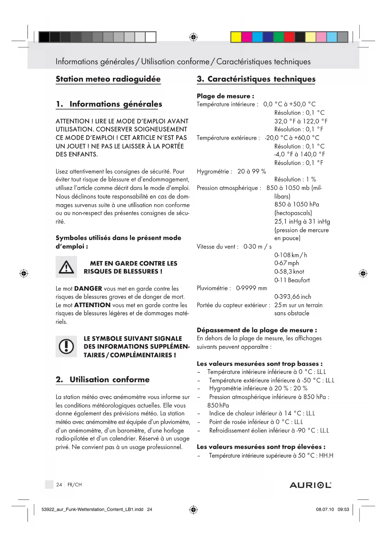 MATÉRIELS ! Utiliser exclusivement des piles du type indiqué. Respecter la polarité. Vérifier régulièrement que les piles ne fuient pas. Si l’appareil reste longtemps inutilisé, retirer les piles. Ne tremper ni la station météo ni le capteur ex- térieur dans l’eau ou un autre liquide. Respecter les consignes de nettoyage et de ran- gement de ce mode d’emploi. 53922_aur_Funk-Wetterstation_Content_LB1.indd 25 08.07.10 09:5326 FR/CH Fourniture / Définitions