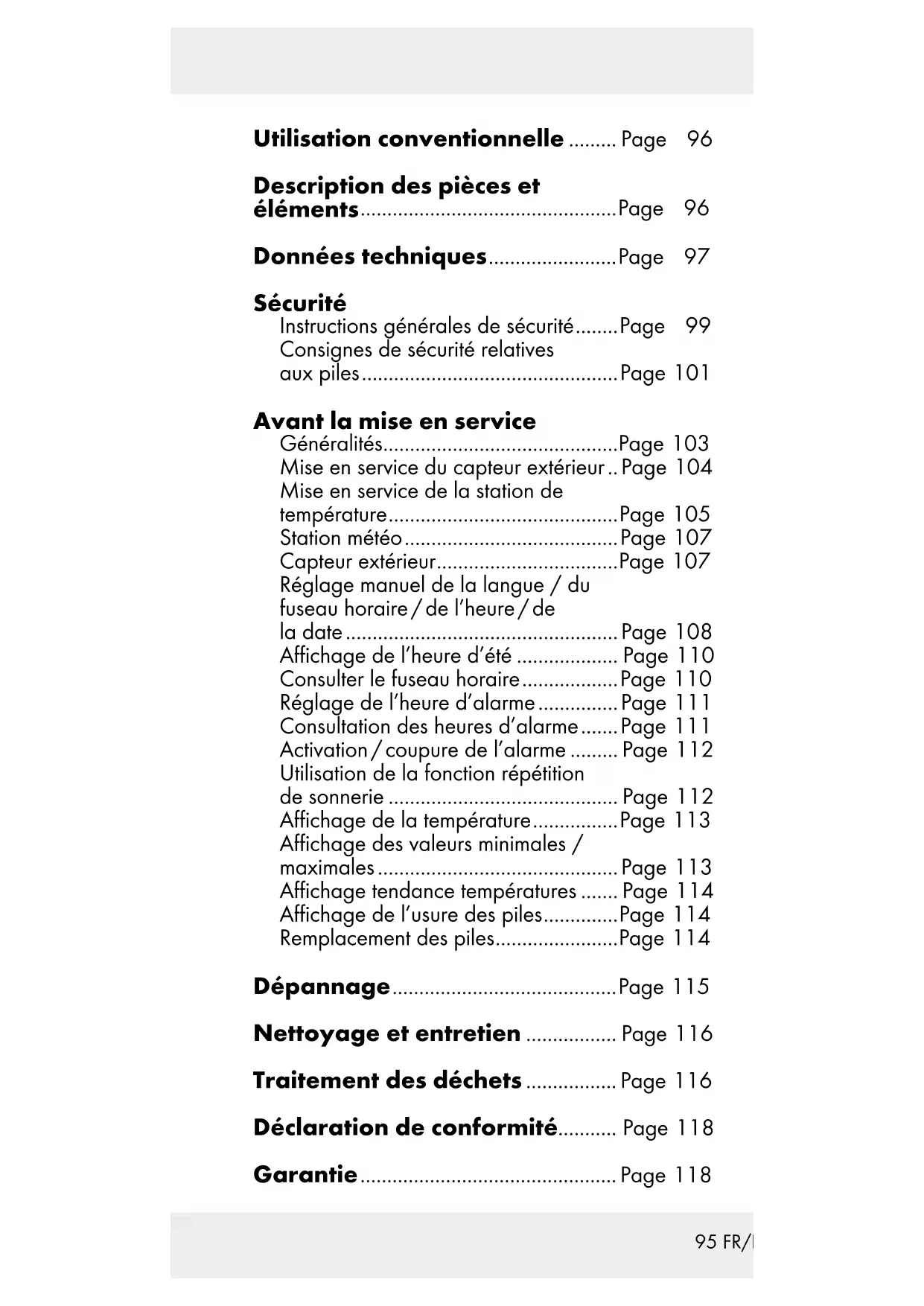 for normalt slid og derfor kan betragtes som nor male sliddele (f.eks. batterier) eller ved skader på skrøbelige dele; f.eks. kontakter, akkumulatorer som er fremstil- let i glas.95 FR/BE Utilisation conventionnelle ......... Page 96 Description des pièces et éléments ................................................ Page 96 Données techniques ........................ Page 97 Sécurité Instructions générales de sécurité ........ Page 99 Consignes de sécurité relatives aux piles ................................................ Page 101 Avant la mise en service Généralités ............................................ Page 103 Mise en service du capteur extérieur .. Page 104 Mise en service de la station de température ........................................... Page 105 Station météo ........................................ Page 107 Capteur extérieur .................................. Page 107 Réglage manuel de la langue / du fuseau horaire / de l’heure / de la date ................................................... Page 108 Affichage de l’heure d’été ................... Page 110 Consulter le fuseau horaire .................. Page 110 Réglage de l’heure d’alarme ............... Page 111 Consultation des heures d’alarme ....... Page 111 Activation / coupure de l’alarme ......... Page 112 Utilisation de la fonction répétition de sonnerie ........................................... Page 112 Affichage de la température ................ Page 113 Affichage des valeurs minimales / maximales ............................................. Page 113 Affichage tendance températures ....... Page 114 Affichage de l’usure des piles .............. Page 114 Remplacement des piles ....................... Page 114 Dépannage .......................................... Page 115 Nettoyage et entretien ................. Page 116 Traitement des déchets ................. Page 116 Déclaration de conformité........... Page 118 Garantie ................................................ Page 11896 FR/BE Station météo Utilisation conventionnelle La station de température vous donne la tem- pérature intérieures et extérieure en Celsius (°C) ou Fahrenheit (°F) ainsi que leurs valeurs maximales et minimales. Les autres valeurs affichées par la station de température sont l‘heure en format 12- / 24 ainsi que la date. La station de températre dispose en outre d‘une fonction alarme. Cet appareil n’est pas conçu pour une utilisation commerciale. Description des pièces et éléments Écran à cristaux liquides