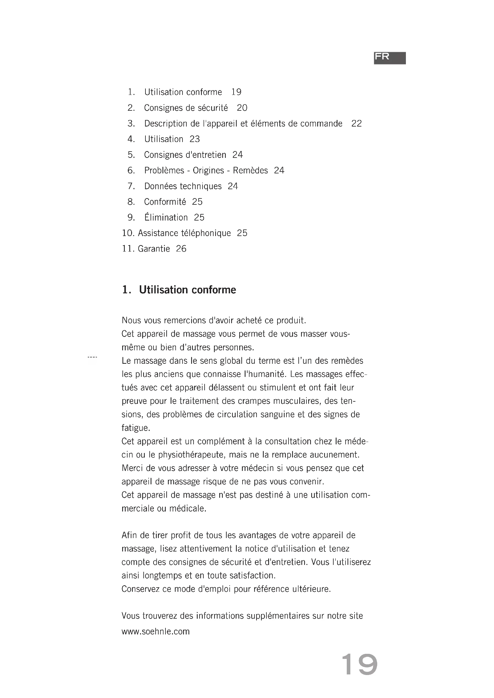 Nous vous remercions d'avoir acheté ce produit. Cet appareil de massage vous permet de vous masser vous- même ou bien d’autres personnes. Le massage dans le sens global du terme est l’un des remèdes les plus anciens que connaisse l'humanité. Les massages effec- tués avec cet appareil délassent ou stimulent et ont fait leur preuve pour le traitement des crampes musculaires, des ten- sions, des problèmes de circulation sanguine et des signes de fatigue. Cet appareil est un complément à la consultation chez le méde- cin ou le physiothérapeute, mais ne la remplace aucunement. Merci de vous adresser à votre médecin si vous pensez que cet appareil de massage risque de ne pas vous convenir. Cet appareil de massage n'est pas destiné à une utilisation com- merciale ou médicale. Afin de tirer profit de tous les avantages de votre appareil de massage, lisez attentivement la notice d'utilisation et tenez compte des consignes de sécurité et d'entretien. Vous l'utiliserez ainsi longtemps et en toute satisfaction. Conservez ce mode d'emploi pour référence ultérieure. Vous trouverez des informations supplémentaires sur notre site www.soehnle.com20