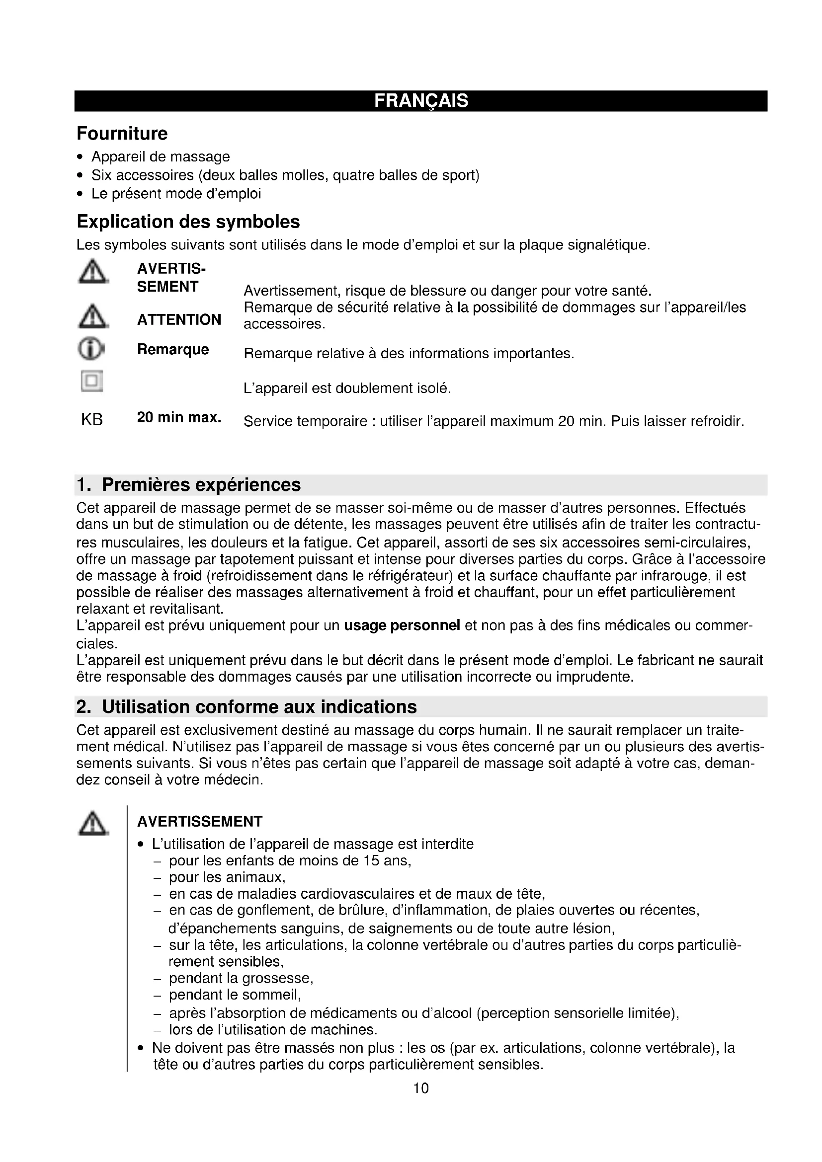Cet appareil est exclusivement destiné au massage du corps humain. Il ne saurait remplacer un traite- ment médical. N’utilisez pas l’appareil de massage si vous êtes concerné par un ou plusieurs des avertis- sements suivants. Si vous n’êtes pas certain que l’appareil de massage soit adapté à votre cas, deman- dez conseil à votre médecin.