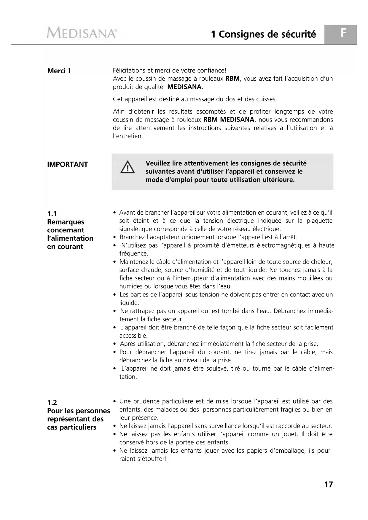 Afin d'obtenir les résultats escomptés et de profiter longtemps de votre coussin de massage à rouleaux RBM MEDISANA, nous vous recommandons de lire attentivement les instructions suivantes relatives à l'utilisation et à l'entretien.