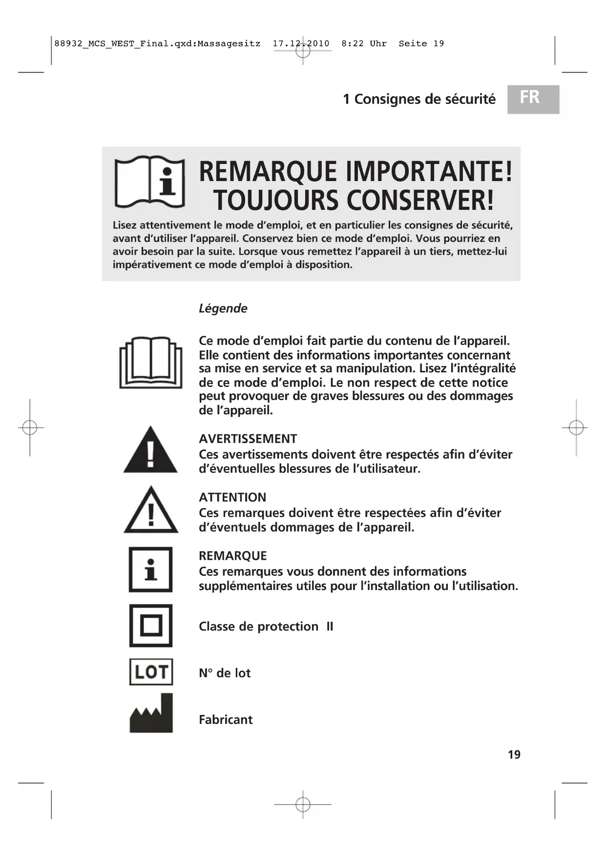 REMARQUE IMPORTANTE! TOUJOURS CONSERVER!