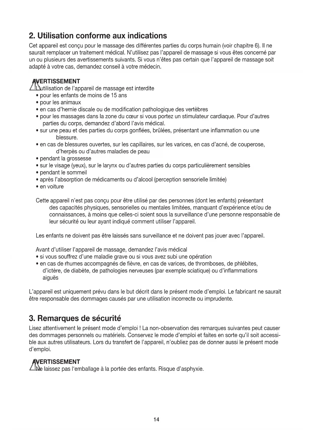 Cetappareilestconçupourlemassagedesdifférentespartiesducorpshumain(voirchapitre6).Ilne sauraitremplaceruntraitementmédical.N’utilisezpasl’appareildemassagesivousêtesconcernépar unouplusieursdesavertissementssuivants.Sivousn’êtespascertainquel’appareildemassagesoit adaptéàvotrecas,demandezconseilàvotremédecin. AVERTISSEMENT L’utilisationdel’appareildemassageestinterdite