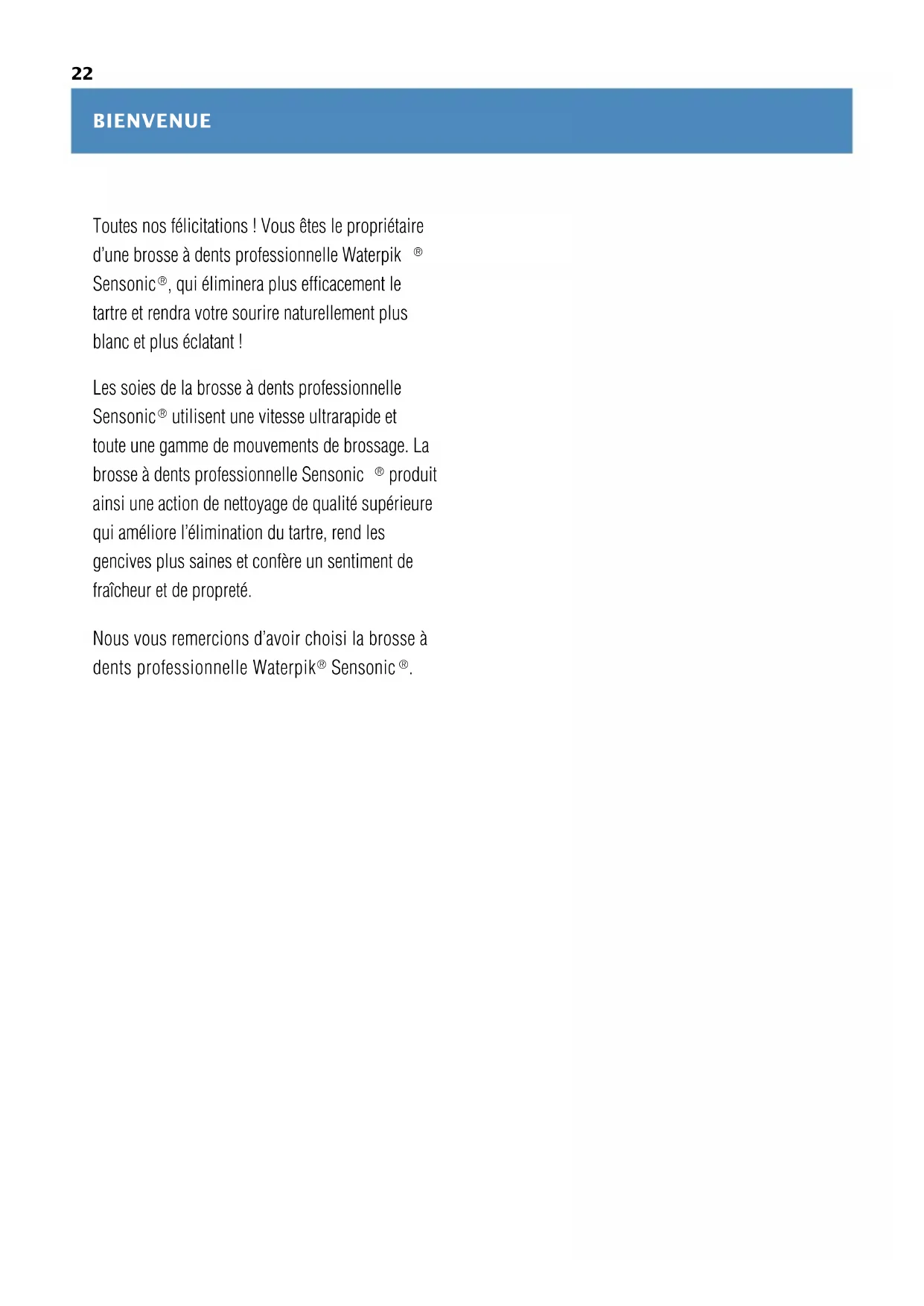 Toutes nos félicitations! Vous estes le propriétaire d'une Brosse à dents professionnelle Waterpik ® Sensonic®, qui éliminera plus efficacement le tartre et rendra votre sourire naturellement plus blanc et plus éclatant!