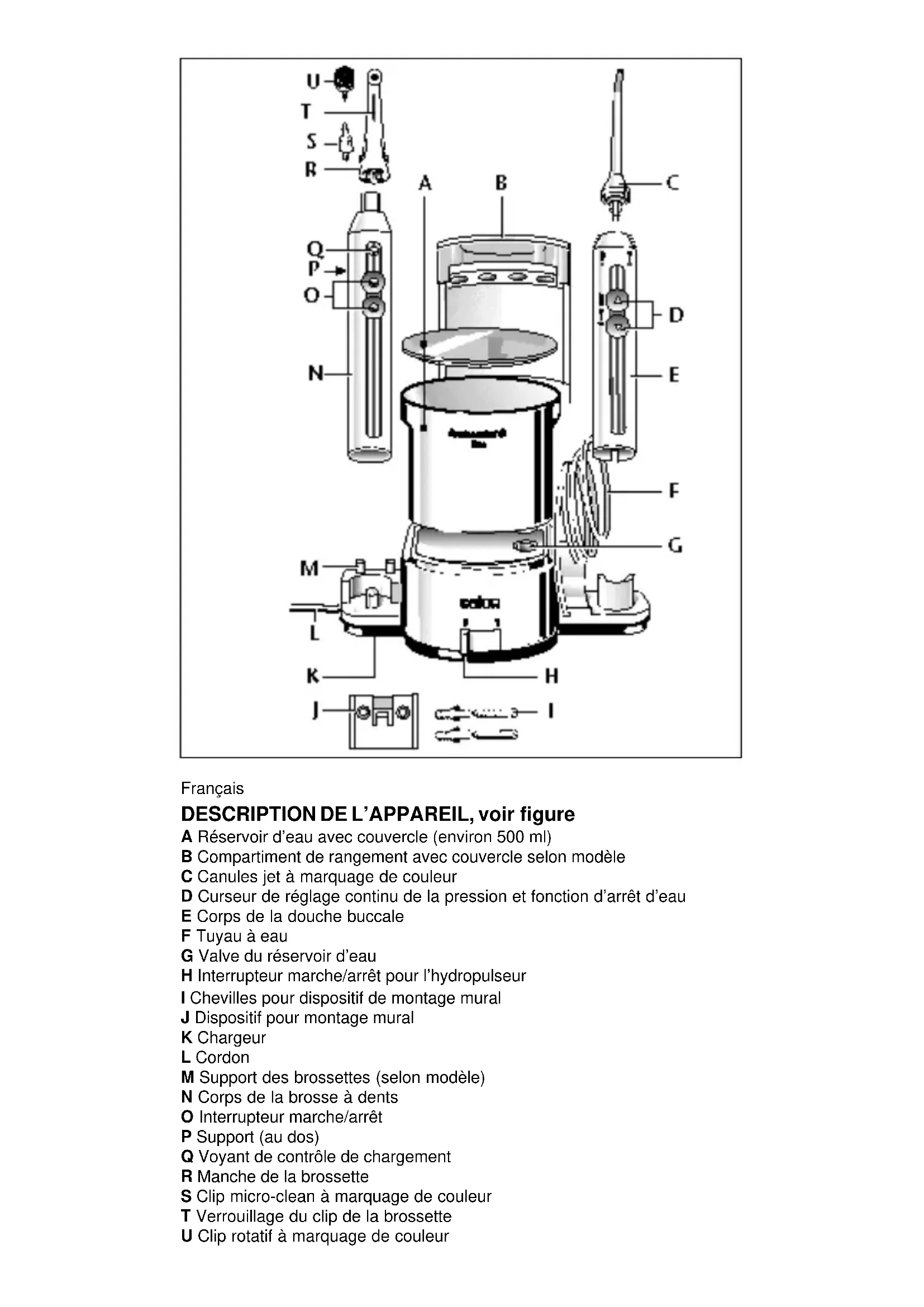23Français DESCRIPTION DE L’APPAREIL, voir figure A Réservoir d’eau avec couvercle (environ 500 ml) B Compartiment de rangement avec couvercle selon modèle C Canules jet à marquage de couleur D Curseur de réglage continu de la pression et fonction d’arrêt d’eau E Corps de la douche buccale F Tuyau à eau G Valve du réservoir d’eau H Interrupteur marche/arrêt pour l’hydropulseur I Chevilles pour dispositif de montage mural J Dispositif pour montage mural K Chargeur L Cordon M Support des brossettes (selon modèle) N Corps de la brosse à dents O Interrupteur marche/arrêt P Support (au dos) Q Voyant de contrôle de chargement R Manche de la brossette S Clip micro-clean à marquage de couleur T Verrouillage du clip de la brossette U Clip rotatif à marquage de couleur! CONSIGNES DE SÉCURITÉ : d L’appareil est conforme aux directives communautaires de sécurité et de compatibilité électro-magnétique. c Courant alternatif seulement, vérifier que la tension du réseau corres- ponde bien à celle indiquée sur la plaque signalétique de l’appareil. c Attention :La brosse rechargeable possède un accu à tension continue de 2,4 V env. et n’est pas reliée au secteur durant l’utilisation. c Prudence ! L’appareil est relié à une tension alternative 230 V-50 Hz et ne peut donc pas être utilisé sous la douche, dans la baignoire ou au- dessus d’un lavabo rempli d’eau. c L’appareil doit être fixé de sorte à ne pas pouvoir tomber dans l’eau pen- dant l’utilisation et le rangement. c Il faut que la fiche soit accessible après la fixation de l’appareil. c Ne pas plonger l’appareil dans l’eau ! c Débrancher l’appareil avant chaque nettoyage ou entretien. c Ne pas remplir le réservoir d’eau chaude et ne jamais mettre l’appareil en service sans eau. c Ne jamais tirer sur le cordon pour débrancher l’appareil. c Ne pas faire fonctionner l’appareil si : – l’appareil ou le cordon sont endommagés, – l’appareil est tombé par terre. Dans ce cas, ne pas l’ouvrir, mais le retourner à un Centre Service agréé Calor (les adresses figurent sur la liste jointe). c Un cordon défectueux ou endommagé ne doit être remplacé que par un Centre Service agréé Calor en vue d’éviter tous les risques. c Ne pas ouvrir l’appareil.En cas d’anomalie, retourner l’appareil complet à un Centre Service agréé Calor (les adresses figurent sur la liste jointe). c Confier les réparations uniquement à un spécialiste. Réparer un appa- reil soi-même peut constituer un danger pour l’utilisateur. c Les corps de brosses 6955/6957. ne doivent être utilisés qu’avec des chargeurs des modèles équivalents. c La brosse à dents est équipée d’accus rechargeables. Ne pas les jeter aux ordures ménagères mais les remettre au Centre Service agréé Calor le plus proche ou aux lieux spécialement prévus à cet effet. c Pour d’éventuelles détériorations de l’appareil dues à une utilisation inappropriée ou non conforme au mode d’emploi (voir : “Ce que vous devez savoir”), aucune responsabilité ne peut engager Calor. d Si l’appareil ne peut plus servir, le rendre définitivement inutilisable et l’envoyer dans une déchetterie.