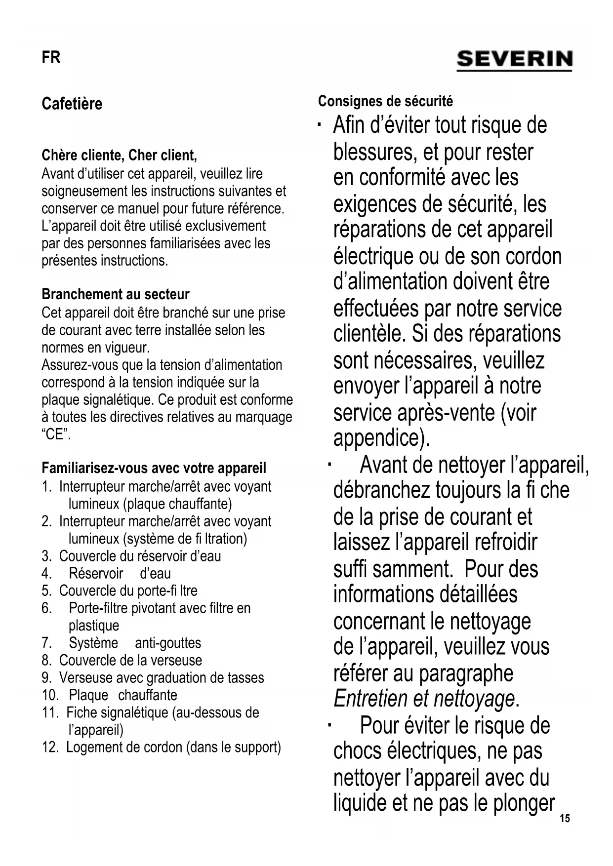 Consignes de sécurité ∙ A fi n d’éviter tout risque de blessures, et pour rester en conformité avec les exigences de sécurité, les réparations de cet appareil électrique ou de son cordon d’alimentation doivent être effectuées par notre service clientèle. Si des réparations sont nécessaires, veuillez envoyer l’appareil à notre service après-vente (voir appendice). ∙ Avant de nettoyer l’appareil, débranchez toujours la fi che de la prise de courant et laissez l’appareil refroidir suffi samment. Pour des informations détaillées concernant le nettoyage de l’appareil, veuillez vous référer au paragraphe Entretien et nettoyage. ∙ Pour éviter le risque de chocs électriques, ne pas nettoyer l’appareil avec du liquide et ne pas le plonger FR16 dans du liquide. ∙ Attention : Une mauvaise utilisation peut provoquer des blessures corporelles graves. ∙ Attention : La plaque chauffante devient très chaude pendant le fonctionnement et reste ensuite chaude pendant quelques temps. ∙ Cet appareil est destiné à une utilisation domestique ou similaire, telle que - dans les cuisines pour personnel, dans des bureaux et autres locaux commerciaux, - dans des organisations agricoles, - par la clientèle dans les hôtels, motels et hébergements similaires, - et dans des maisons d’hôtes. ∙ Cet appareil peut être utilisé par des enfants (à partir de 8 ans) et par des personnes souffrant de défi ciences physiques, sensorielles ou mentales, ou manquant d’expérience ou de connaissances, s’ils ont été formés à l’utilisation de l’appareil et ont été supervisés, et s’ils en comprennent les dangers et les précautions de sécurité à prendre. ∙ Les enfants ne sont pas autorisés à jouer avec l’appareil. ∙ Les enfants ne doivent pas être autorisés à nettoyer ou entretenir l’appareil à moins d’être supervisés et d’avoir plus de 8 ans. ∙ L’appareil et son cordon d’alimentation doivent être, à tout moment, tenus hors de portée des enfants de moins de 8 ans. ∙ Attention : Tenez les enfants à l’écart des emballages, qui représentent un risque potentiel, par exemple, de suffocation.17 ∙ Avant toute utilisation, vérifi ez soigneusement que l’appareil, son cordon d’alimentation et ses accessoires ne présentent aucun signe de détérioration qui pourrait avoir un effet néfaste sur la sécurité de fonctionnement de l’appareil. Au cas où l’appareil, par exemple, serait tombé sur une surface dure, ou si une force excessive aurait été employée pour tirer sur le cordon d’alimentation, il ne doit plus être utilisé. ∙ Avant utilisation, vérifi ez que la poignée de la verseuse est correctement et solidement attachée. ∙ Pendant l’utilisation, la cafetière doit être placée sur une surface plane, antidérapante et imperméable aux éclaboussures et taches. ∙ Ne laissez jamais l’appareil ou le cordon d’alimentation toucher une surface chaude ou entrer en contact avec une source de chaleur. ∙ Attention : La plaque chauffante devient très chaude pendant le fonctionnement. ∙ Pour éviter tout risque de dégagement d’eau chaude ou de vapeur, éteignez toujours la cafetière et laissez-la refroidir avant de l’ouvrir ou d’en retirer les accessoires. ∙ Les enfants doivent être surveillés afi n qu’ils ne jouent pas avec l’appareil. ∙ Retirez la fi che de la prise murale - en cas de fonctionnement anormal, - avant de nettoyer l’appareil, - si l’appareil reste longtemps sans être utilisé. ∙ Ne débranchez pas l’appareil en tirant sur le cordon ; tirez toujours sur la fi che. ∙ Ne laissez pas le cordon d’alimentation pendre librement ; le cordon doit toujours être tenu à l’écart des surfaces chaudes de l’appareil. ∙ Nous déclinons toute responsabilité pour les dommages éventuels subis par cet appareil, résultant d’une utilisation incorrecte ou du non-respect de ce mode d’emploi. La première mise en marche ∙ Avant la première utilisation, rincer votre cafetière en la faisant fonctionner une ou deux fois comme décrit dans le paragraphe Préparation du café, avec environ 6 tasses d’eau, mais sans mouture. Préparation du café ∙ Pour des petites quantités de café, il est recommandé de placer la verseuse sur la plaque chauffante avant d’allumer la cafetière. Ainsi, le café fraîchement percolé coulera dans la verseuse préchauffée. ∙ Ouvrir le porte-fi ltre pivotant (6) et retirer le couvercle (5) (image I). ∙ Placer un fi ltre papier (1x4) dans le fi ltre plastique. ∙ Nous vous recommandons d’utiliser du café moulu fi n: ∙ grande tasse: environ 6 g = 2 cuillères à café, ∙ petite tasse: environ 4 g = 1½ cuillère à café. ∙ La quantité de café moulu utilisée peut varier selon votre goût personnel. ∙ Remettre le couvercle (5), puis refermer le porte-fi ltre pivotant (6). ∙ Ouvrir le couvercle du réservoir (3) et verser la quantité d’eau froide désirée (pour 2 grandes tasses minimum) dans le réservoir (4) (image II). ∙ Les graduations à l’intérieur du réservoir18 d’eau vous permettent de mesurer facilement la quantité d’eau nécessaire pour le nombre de tasses que vous désirez : - graduation à gauche : grandes tasses (environ 125 ml), - graduation à droite : petites tasses. ∙ Faire attention à ne pas dépasser le niveau d’eau maximal pour 8 grandes tasses. Si le réservoir est trop plein, il y a risque d’éclaboussures d’eau bouillante (danger de brûlures !). ∙ Fermer le couvercle du réservoir (3). Ceci est important puisque le système „Vapotronic“ ne peut fonctionner qu’avec couvercle fermé. ∙ Repositionner la verseuse (9) avec son couvercle (8) sur la plaque chauffante (10). Le couvercle de la verseuse commande l’ouverture de la soupape du système anti-gouttes (image III). ∙ Mettre en marche la plaque chauffante (10) en appuyant sur l’interrupteur marche/a