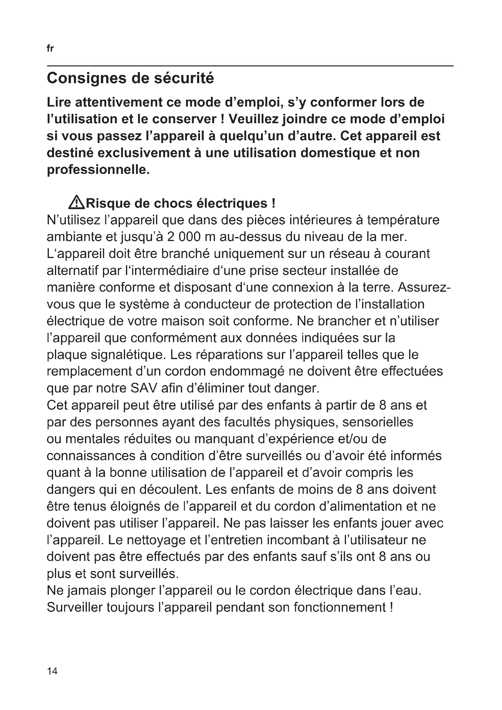 Cet appareil peut être utilisé par des enfants à partir de 8 ans et par des personnes ayant des facultés physiques, sensorielles ou mentales réduites ou manquant d'expérience et/ou de connaissances à condition d'être surveillés ou d'avoir été informés quant à la bonne utilisation de l'appareil et d'avoir compris les dangers qui en découlent. Les enfants de moins de 8 ans doivent être tenus éloignés de l'appareil et du cordon d'alimentation et ne doivent pas utiliser l'appareil. Ne pas laisser les enfants jouer avec l'appareil. Le nettoyage et l'entretien incombant à l'utilisateur ne doit pas être effectué par des enfants sauf s'ils ont 8 ans ou plus et sont surveillés.