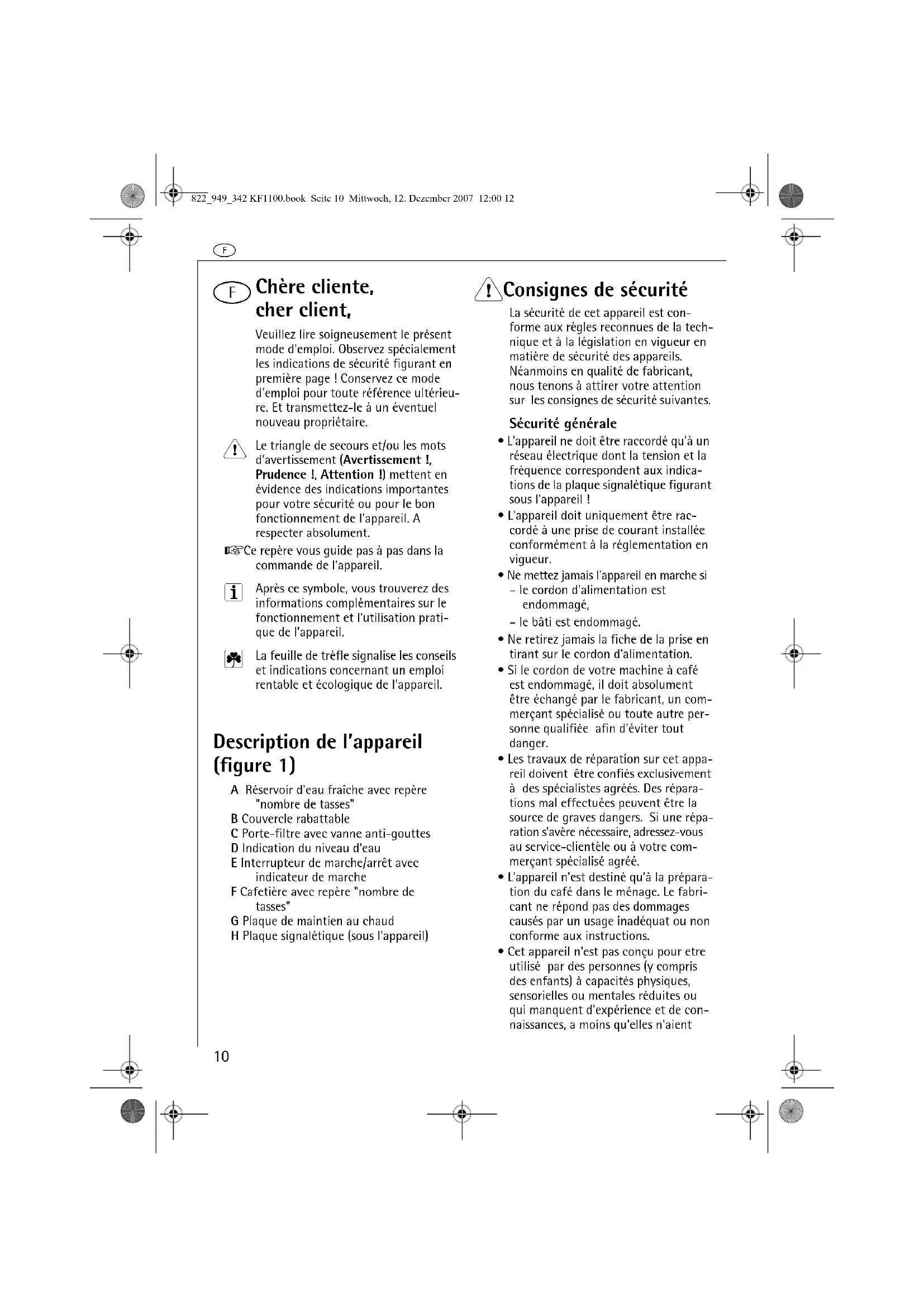 - L'appareil n'est destiné qu'à la préparation du café dans le ménage. Le fabricant ne répond pas des dommages causés par un usage inadéquat ou non conforme aux instructions.