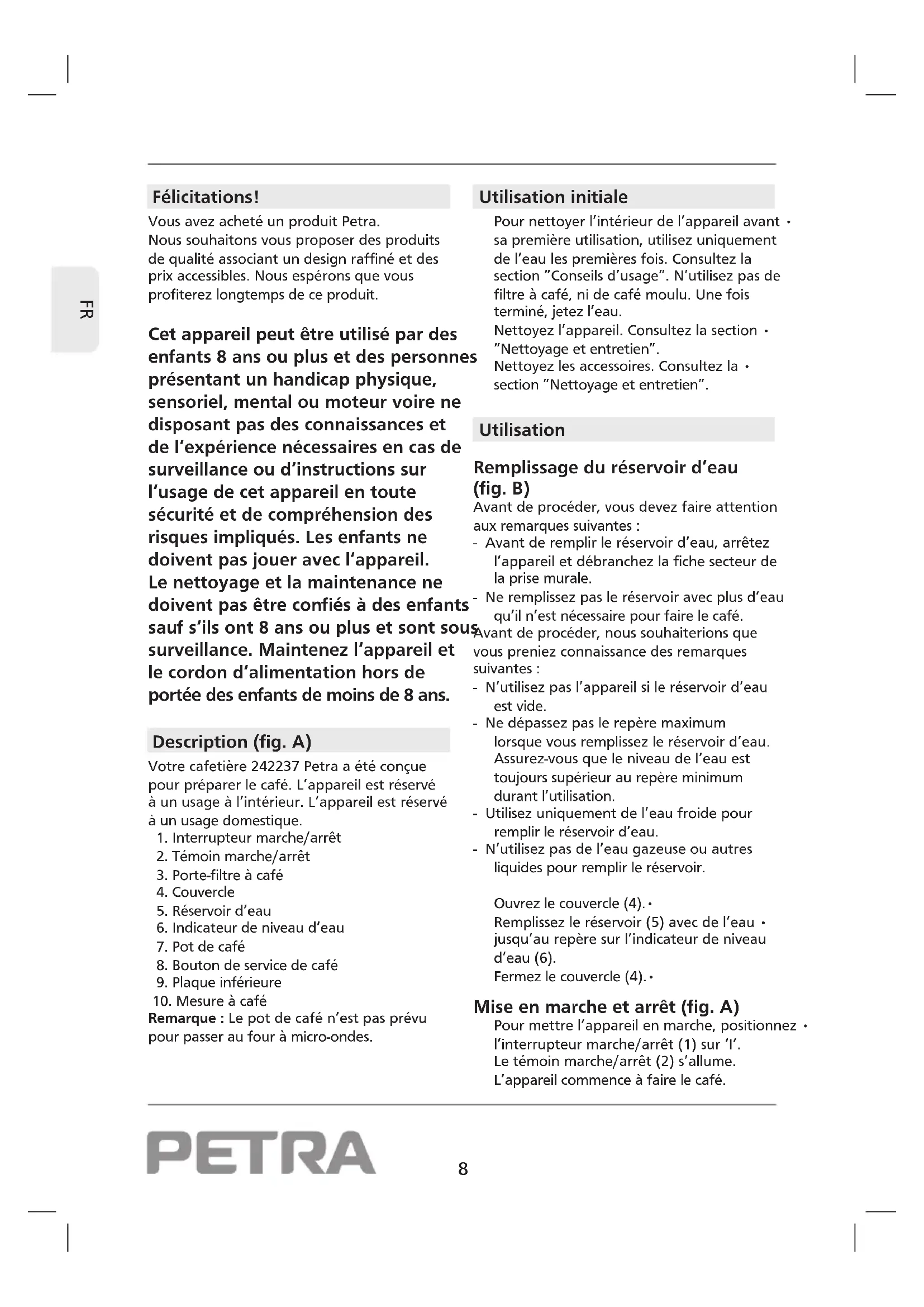 Félicitations! Vous avez acheté un produit Petra. Nous souhaitons vous proposer des produits de qualité associant un design raffiné et des prix accessibles. Nous espérons que vous profiterez longtemps de ce produit. Cet appareil peut être utilisé par des enfants 8 ans ou plus et des personnes présentant un handicap physique, sensoriel, mental ou moteur voire ne disposant pas des connaissances et de l‘expérience nécessaires en cas de surveillance ou d‘instructions sur l‘usage de cet appareil en toute sécurité et de compréhension des risques impliqués. Les enfants ne doivent pas jouer avec l‘appareil. Le nettoyage et la maintenance ne doivent pas être confiés à des enfants sauf s‘ils ont 8 ans ou plus et sont sous surveillance. Maintenez l‘appareil et le cordon d‘alimentation hors de portée des enfants de moins de 8 ans. Description (fig. A) Votre cafetière 242237 Petra a été conçue pour préparer le café. L’appareil est réservé à un usage à l’intérieur. L’appareil est réservé à un usage domestique.