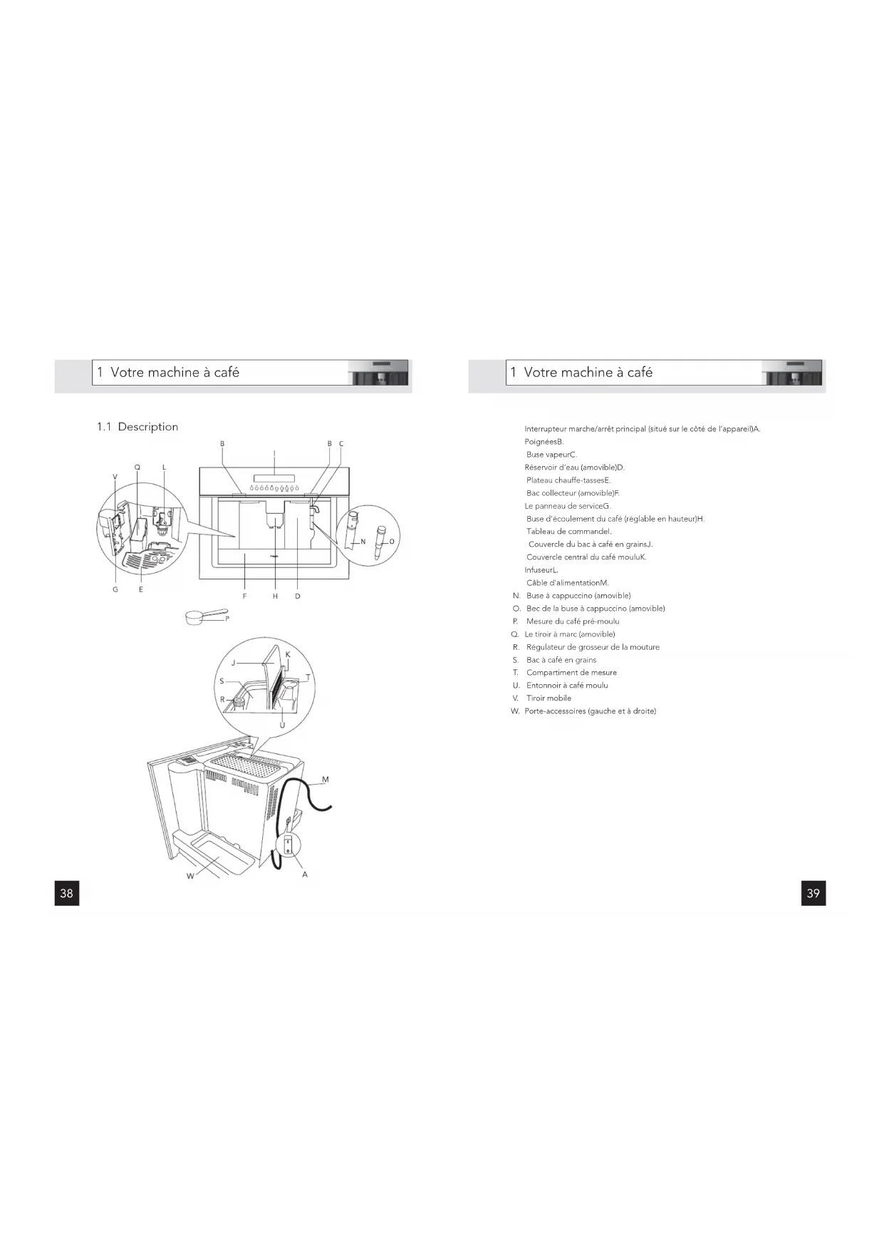 Op het gegevensplaatje aan de zijkant van het toestel worden de totale aansluitwaarde, de vereiste spanning en de frequentie aangegeven.39 1 Votre machine à café Interrupteur marche/arrêt principal (situé sur le côté de l’appareil)A. PoignéesB. Buse vapeurC. Réservoir d’eau (amovible)D. Plateau chauffe-tassesE. Bac collecteur (amovible)F. Le panneau de serviceG. Buse d’écoulement du café (réglable en hauteur)H. Tableau de commandeI. Couvercle du bac à café en grainsJ. Couvercle central du café mouluK. InfuseurL. Câble d’alimentationM. Buse à cappuccino (amovible)N. Bec de la buse à cappuccino (amovible)O. Mesure du café pré-mouluP. Le tiroir à marc (amovible)Q. Régulateur de grosseur de la moutureR. Bac à café en grainsS. Compartiment de mesureT. Entonnoir à café mouluU. Tiroir mobileV. Porte-accessoires (gauche et à droite)W.