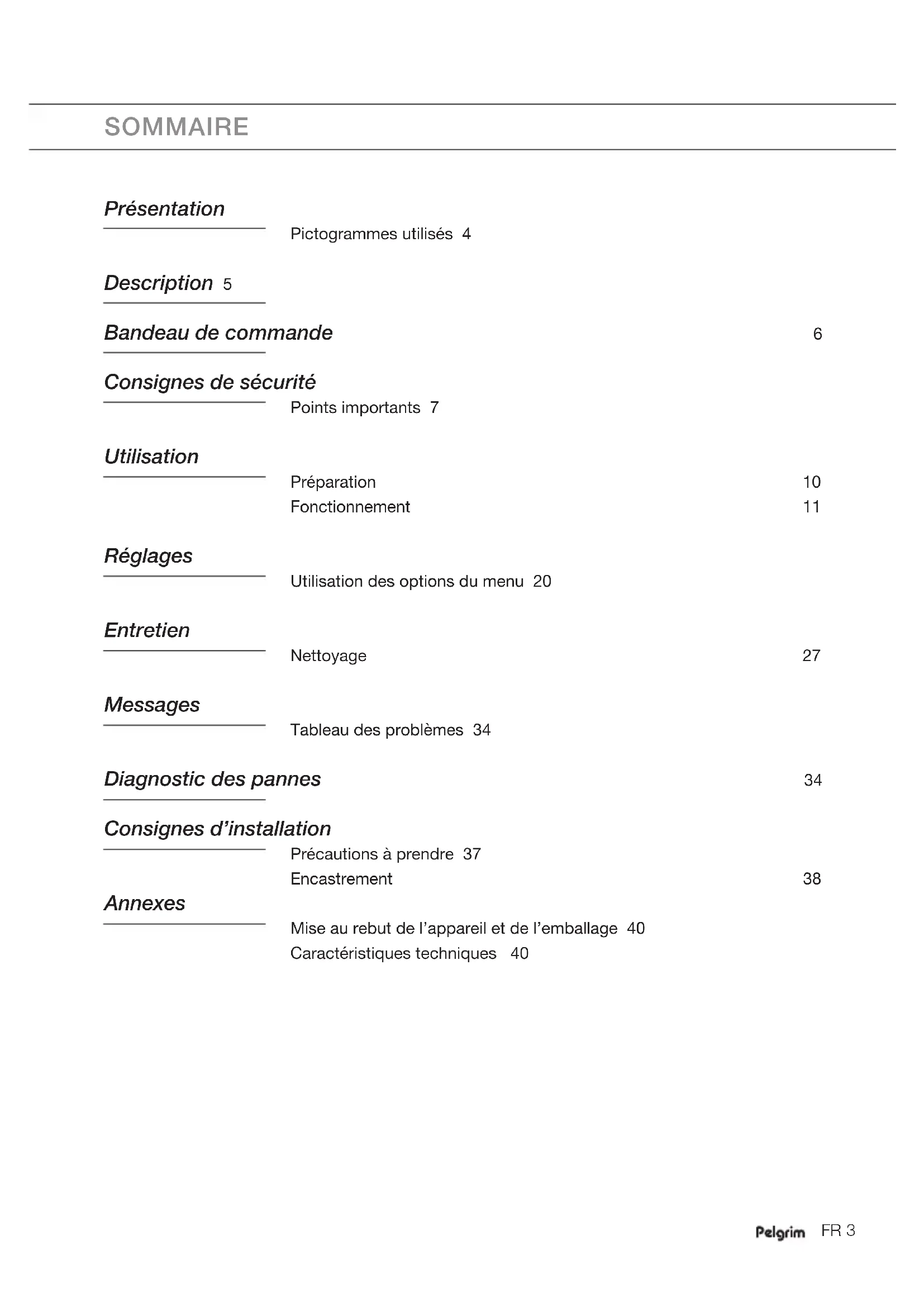 - polypropyleentape (PP) Gooi deze materialen op een verantwoorde manier weg overeenkomstig de wettelijke bepalingen. Op het product is het symbool van een doorgekruiste vuilnisbak aangebracht om op de verplichting tot gescheiden verwerking te wijzen. Dit voorkomt negatieve gevolgen voor het milieu en de gezondheid. Dit houdt in dat het product aan het eind van de levensduur naar een speciaal centrum voor gescheiden afvalinzameling van de gemeente of naar de leverancier moet worden gebracht. Het aparte verwerken zorgt ervoor dat materialen waaruit dit apparaat bestaat, kunnen worden teruggewonnen, wat een aanzienlijke besparing van energie en grondstoffen betekent. Verklaring van overeenstemming Wij verklaren dat onze producten voldoen aan de toepasselijke Europese richtlijnen, normen en voorschriften, alsook aan alle vereisten in de normen waarnaar wordt verwezen. Verordening (EG) nr. 1275/2008 standby Technische gegevens Op het typeplaatje aan de zijkant van het apparaat staat de totale belasting wanneer aangesloten, het vereiste voltage en de frequentie.FR 3 SOMMAIRE Présentation Pictogrammes utilisés 4 Description 5 Bandeau de commande 6 Consignes de sécurité Points importants 7 Utilisation Préparation 10 Fonctionnement 11 Réglages Utilisation des options du menu 20 Entretien Nettoyage 27 Messages Tableau des problèmes 34 Diagnostic des pannes 34 Consignes d’installation Précautions à prendre 37 Encastrement 38 Annexes Mise au rebut de l’appareil et de l’emballage 40 Caractéristiques techniques 40FR 4 PRÉSENTATION Avec cette machine à café, vous préparerez un café, un expresso ou un cappuccino délicieux. Vous pouvez régler la machine en fonction de vos préférences et goûts personnels. Du café a été utilisé pour tester la machine à café à l’usine, raison pour laquelle il est absolument normal que l’on trouve un peu de café dans le broyeur. Il est toutefois garanti que cet appareil est neuf. Avant d’utiliser l’appareil, lisez attentivement et intégralement le mode d’emploi et conservez-le en vue d’une consultation ultérieure. Entretien préventif Votre machine à café nécessite un entretien préventif. Pour garantir un fonctionnement de la machine à café correct et fi able, Pelgrim conseille de faire effectuer une révision tous les deux ou trois ans (après 8000 tasses au maximum). Pictogrammes utilisés Information importante Danger ! Appareil électrique Danger de brûlures Conseil Les éléments qui peuvent entrer en contact avec du café ou du lait satisfont aux prescriptions de la directive CEE 1935/2004 concernant les matériaux destinés à entrer en contact avec des denrées alimentaires. Cet appareil est conforme à la directive européenne 2004/108/CE relative aux déchets d'équipements électriques et électroniques (DEEE).FR 5 DESCRIPTION A. Interrupteur principal / Aa. Bouton marche/arrêt et veille B. Poignées C. Buse D. Réservoir d’eau (amovible) E. Plateau à tasses F. Bac collecteur G. Panneau de service H. Distributeur de café, réglable en hauteur