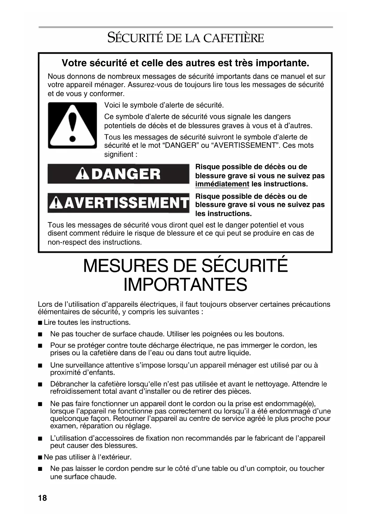 IMPORTANTES Lors de l’utilisation d’appareils électriques, il faut toujours observer certaines précautions élémentaires de sécurité, y compris les suivantes :■ Lire toutes les instructions. ■ Ne pas toucher de surface chaude. Utiliser les poignées ou les boutons. ■ Pour se protéger contre toute décharge électrique, ne pas immerger le cordon, les prises ou la cafetière dans de l’eau ou dans tout autre liquide. ■ Une surveillance attentive s’impose lorsqu’un appareil ménager est utilisé par ou à proximité d’enfants. ■ Débrancher la cafetière lorsqu'elle n’est pas utilisée et avant le nettoyage. Attendre le refroidissement total avant d’installer ou de retirer des pièces. ■ Ne pas faire fonctionner un appareil dont le cordon ou la prise est endommagé(e), lorsque l’appareil ne fonctionne pas correctement ou lorsqu’il a été endommagé d’une quelconque façon. Retourner l’appareil au centre de service agréé le plus proche pour examen, réparation ou réglage. ■ L’utilisation d’accessoires de fixation non recommandés par le fabricant de l’appareil peut causer des blessures.■ Ne pas utiliser à l'extérieur. ■ Ne pas laisser le cordon pendre sur le côté d’une table ou d’un comptoir, ou toucher une surface chaude.Risque possible de décès ou de blessure grave si vous ne suivez pas immédiatement les instructions. Risque possible de décès ou de blessure grave si vous ne suivez pas les instructions. Tous les messages de sécurité vous diront quel est le danger potentiel et vous disent comment réduire le risque de blessure et ce qui peut se produire en cas de non-respect des instructions. Votre sécurité et celle des autres est très importante. Nous donnons de nombreux messages de sécurité importants dans ce manuel et sur votre appareil ménager. Assurez-vous de toujours lire tous les messages de sécurité et de vous y conformer. DANGER Voici le symbole d’alerte de sécurité.Ce symbole d’alerte de sécurité vous signale les dangers potentiels de décès et de blessures graves à vous et à d’autres.Tous les messages de sécurité suivront le symbole d’alerte de sécurité et le mot “DANGER” ou “AVERTISSEMENT”. Ces mots signifient : AVERTISSEMENT19 ■ Ne pas placer sur ou près d’un brûleur électrique ou à gaz chaud, ou dans un four chaud. ■ Ne pas utiliser l'appareil pour un autre usage que celui pour lequel il est conçu. ■ Ne pas faire fonctionner d'appareil sans que le couvercle ne soit correctement placé sur le récipient (carafe). ■ Le récipient (carafe) est conçu pour être utilisé avec cet appareil. Il ne doit jamais être utilisé sur une cuisinière ou dans un four à micro-ondes.■ Ne pas placer de récipient chaud (carafe) sur une surface mouillée ou froide. ■ Ne pas utiliser de récipient fêlé (carafe) ou de récipient dont la poignée est lâche ou si elle n'est pas solide. ■ Ne pas nettoyer de récipient avec des nettoyants abrasifs, des tampons en laine d'acier ou tout autre matériau abrasif.■ Ce produit est conçu uniquement pour un usage domestique.