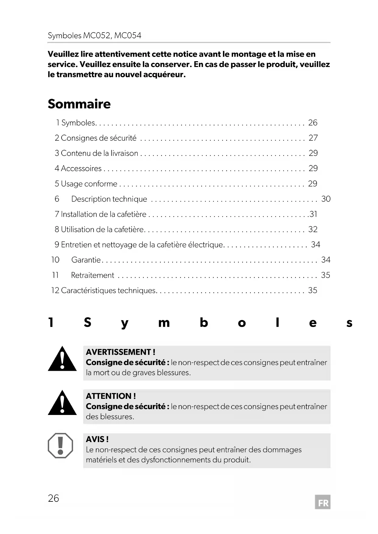 - Veuillez lire attentivement cette notice avant le montage et la mise en service. Veuillez ensuite la conserver. En cas de passer le produit, veuillez le transmettre au nouvel acquéreur. Sommaire 1 Symboles p. 26