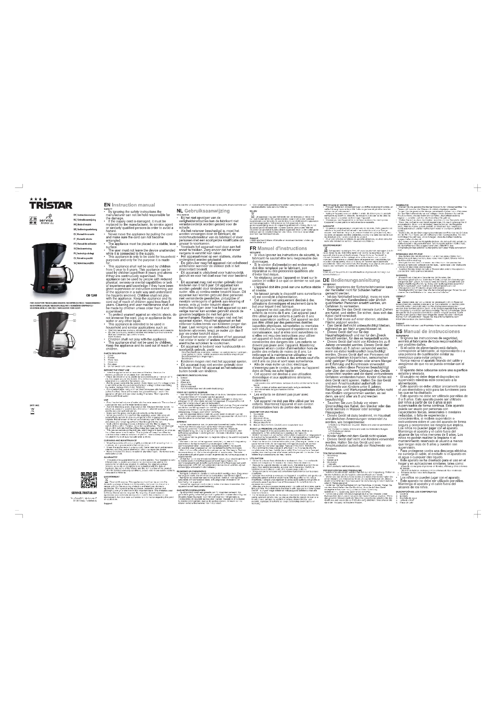 - Cetappareilnedoitpasêtreutiliséparles enfants.Maintenezl'appareiletsoncordon d'alimentationhorsdeportéedesenfants. DESCRIPTIONDESPIÈCES1. Couvercle2. Portefiltre3. Réservoird'eau4. Verseuseenverre5. Plaquechauffante6. BoutonMarche/Arrêt(On/Off)avecvoyantlumineuxAVANTLAPREMIÈREUTILISATION• Sortezl'appareiletlesaccessoireshorsdelaboîte.Retirezlesautocollants,lefilmprotecteurouleplastiquedel'appareil.• Mettezl'appareilsurunesurfacestableplateetassurezundégagementtoutautourdel'appareild'aumoins10cm.Cetappareilneconvientpasàuneinstallationdansunearmoireouàunusageàl'extérieur.• Branchezlecordond’alimentationàlaprise.(Remarque:Veillezàcequelatensionindiquéesurl’appareilcorrespondeàcelledusecteurlocalavantdeconnecterl'appareil.Tension220V240V50/60Hz)• Pouréliminertoutmauvaisgoût,effectuer2ou3cyclesdechauffecompletsavecdel’eaufraîche(sanscafé).Unefoisquetoutel’eauestpassée,éteindrel’appareiletlelaisserrefroidirpendant5minutes.Puisréitérerleprocessusavecdel’eaufraîche.UTILISATION• Verserlevolumed'eaudésirédansleréservoird'eau.Lenombredetassesestindiquésurl'indicateurdeniveaud'eauduréservoir.• Rajouterlaquantitédésiréedecafémoulu.Remettreleportefiltreenplace.Pourmettreenmarche,appuyersurl'interrupteurOn/Off,lacafetièrevasemettreenrouteetlevoyantrouges'allume.• S'assurerquelaverseuseestcorrectementpositionnéesurlaplaquechauffante.• Lorsquevousretirezlaverseusedel'appareil,lesystèmeantigoutteestautomatiquementactivéetempêchelecafédegouttersurlaplaquechauffante.Lorsquevousreplacezlaverseuselesystèmeantgouttevaautomatiquementsedésactiveretl'écoulementducaféfiltrédanslaverseusesepoursuit.• Attendezqueleprocessusdepréparationducafésoitterminéetquelefiltresoitvide.Pouréteindrelamachineàcafé,appuyersurl'interrupteurOn/Off.Levoyantrouges'éteintetindiquequelacafetièreabienétémisehorstension.• Laverseusepeutrestersurlaplaquechauffante.Cellecichauffedèsquelacafetièreestallumée.Laplaquechauffantepermetdemaintenirlecaféchaudtantquelacafetièren'estpaséteinte(NOTE:parsécurité,laplaquechauffantesecoupeautomatiquementaprèsunmoment).NETTOYAGEETENTRETIEN• Essuyezl'extérieuruniquementavecunchiffonlégèrementhumide,enveillantàcequ'aucunehumidité,huileougraissenepénètredanslesorificesderefroidissement.• Nettoyezl'appareilavecunchiffonhumide.N'utilisezpasdeproduitsnettoyantsagressifsouabrasifs,detamponsàrécureroudelainedeverre,ceuxcipourraientendommagerl'appareil.• N'immergezpasl'appareildansdel'eauoudansd'autresliquides.L'appareilnepeutpasêtrenettoyéenlavevaisselle.GARANTIE• Ceproduitestgarantipourunepériodede24mois.Votregarantieestvalablesileproduitestutiliséselonlesinstructionsetpourl'usageauquelilestdestiné.Deplus,lapreuved'achatd'origine(facture,reçuouticketdecaisse)doitêtreprésentée,montrantladated'achat,lenomdudétaillantetlenumérod'articleduproduit.• Pourconnaîtrelesconditionsdegarantiedétaillées,veuillezconsulternotresiteInternetdeservice:www.service.tristar.euENVIRONNEMENTCetappareilnedoitpasêtrejetéaveclesdéchetsménagersàlafindesaduréedevie,ildoitêtreremisàuncentrederecyclagepourlesappareilsélectriquesetélectroniques.Cesymbolesurl'appareil,lemanueld'utilisationetl'emballageattirevotreattentionsurunpointimportant.Lesmatériauxutilisésdanscetappareilsontrecyclables.Enrecyclantvosappareils,vouscontribuezdemanièresignificativeàlaprotectiondenotreenvironnement.Renseignezvousauprèsdesautoritéslocalespourconnaîtrelescentresdecollectedesdéchets.SupportVouspouveztrouvertouteslesinformationsetpiècesderechangesurservice.tristar.eu! DEBedienungsanleitung SICHERHEIT