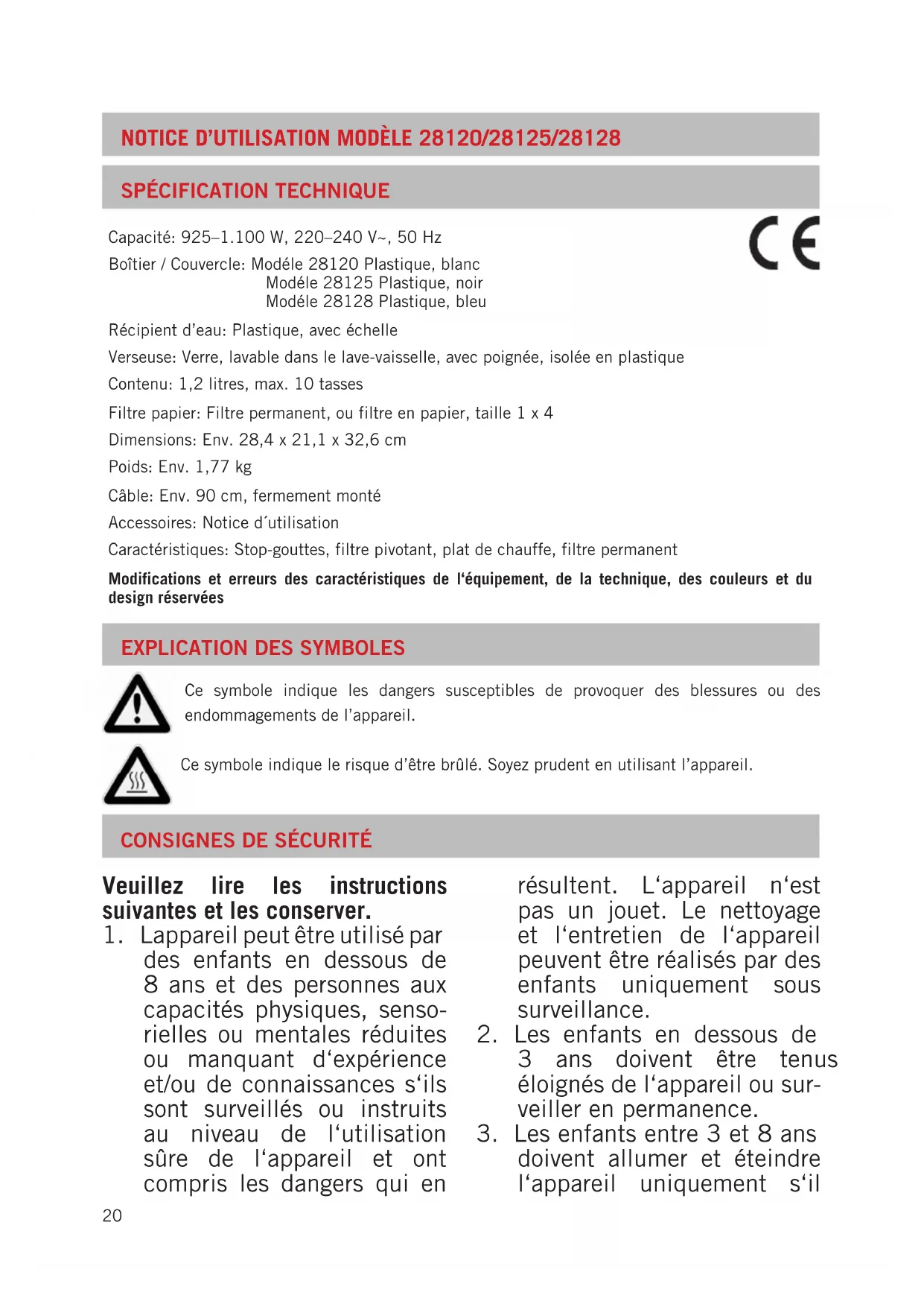 Ce symbole indique les dangers susceptibles de provoquer des blessures ou des endommagements de l’appareil. Ce symbole indique le risque d’être brûlé. Soyez prudent en utilisant l’appareil. Capacité: 925–1.100 W, 220–240 V~, 50 Hz Boîtier / Couvercle: Modéle 28120 Plastique, blanc Modéle 28125 Plastique, noir Modéle 28128 Plastique, bleu Récipient d’eau: Plastique, avec échelle Verseuse: Verre, lavable dans le lave-vaisselle, avec poignée, isolée en plastique Contenu: 1,2 litres, max. 10 tasses Filtre papier: Filtre permanent, ou filtre en papier, taille 1 x 4 Dimensions: Env. 28,4 x 21,1 x 32,6 cm Poids: Env. 1,77 kg Câble: Env. 90 cm, fermement monté Accessoires: Notice d´utilisation Caractéristiques: Stop-gouttes, filtre pivotant, plat de chauffe, filtre permanent Modifications et erreurs des caractéristiques de l‘équipement, de la technique, des couleurs et du design réservées21 se trouve dans la position d‘utilisation prévue norma