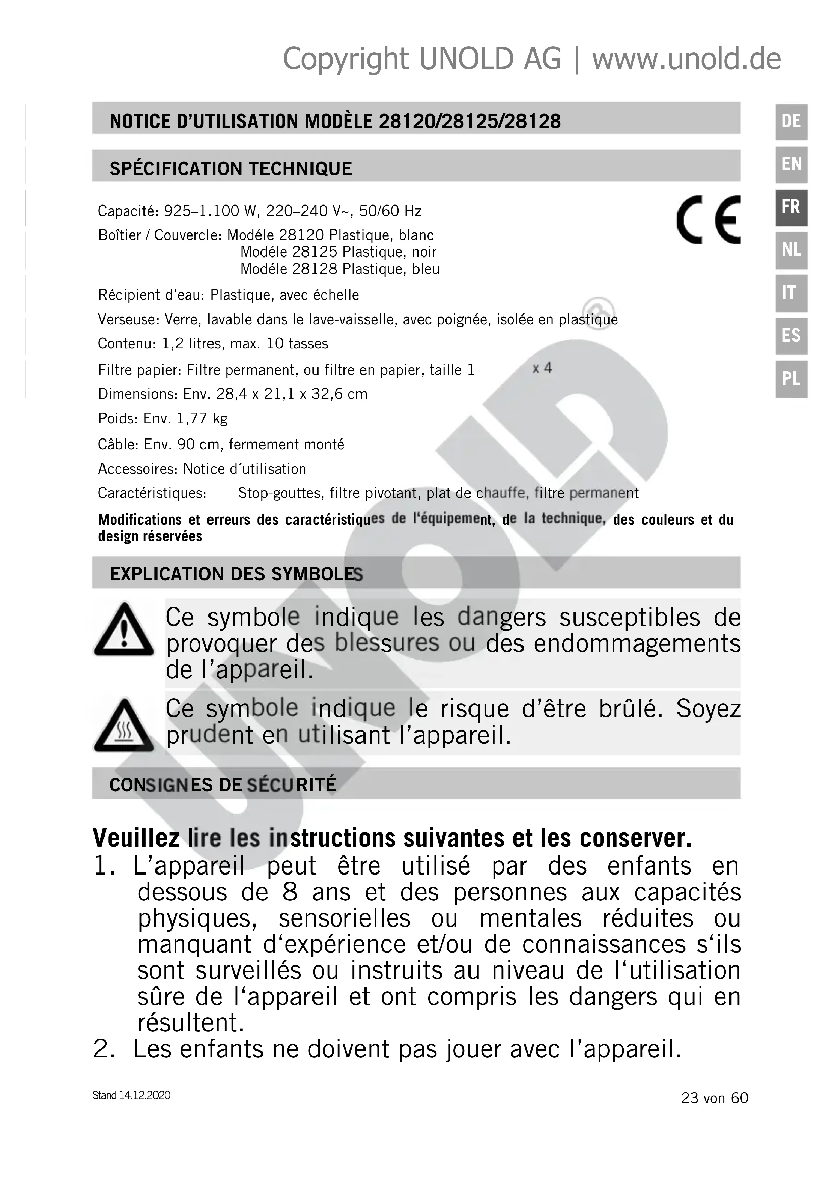 Ce symbole indique les dangers susceptibles de provoquer des blessures ou des endommagements de l’appareil. Ce symbole indique le risque d’être brûlé. Soyez prudent en utilisant l’appareil. Capacité: 925–1.100 W, 220–240 V~, 50/60 Hz Boîtier / Couvercle: Modéle 28120 Plastique, blanc Modéle 28125 Plastique, noir Modéle 28128 Plastique, bleu Récipient d’eau: Plastique, avec échelle Verseuse: Verre, lavable dans le lave-vaisselle, avec poignée, isolée en plastique Contenu: 1,2 litres, max. 10 tasses Filtre papier: Filtre permanent, ou filtre en papier, taille 1 x 4 Dimensions: Env. 28,4 x 21,1 x 32,6 cm Poids: Env. 1,77 kg Câble: Env. 90 cm, fermement monté Accessoires: Notice d´utilisation Caractéristiques: Stop-gouttes, filtre pivotant, plat de chauffe, filtre permanent Modifications et erreurs des caractéristiques de l‘équipement, de la technique, des couleurs et du design réservées Copyright UNOLD AG | www.unold.de24 von 60 Stand 14.12.2020