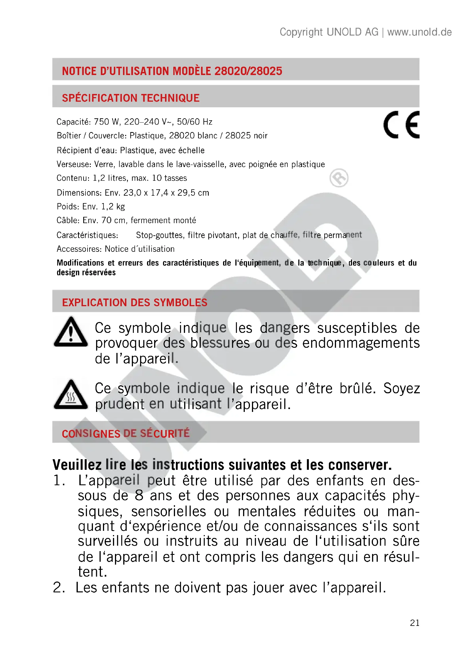 Ce symbole indique les dangers susceptibles de provoquer des blessures ou des endommagements de l’appareil. Ce symbole indique le risque d’être brûlé. Soyez prudent en utilisant l’appareil. Capacité: 750 W, 220–240 V~, 50/60 Hz Boîtier / Couvercle: Plastique, 28020 blanc / 28025 noir Récipient d’eau: Plastique, avec échelle Verseuse: Verre, lavable dans le lave-vaisselle, avec poignée en plastique Contenu: 1,2 litres, max. 10 tasses Dimensions: Env. 23,0 x 17,4 x 29,5 cm Poids: Env. 1,2 kg Câble: Env. 70 cm, fermement monté Caractéristiques: Stop-gouttes, filtre pivotant, plat de chauffe, filtre permanent Accessoires: Notice d´utilisation Modifications et erreurs des caractéristiques de l‘équipement, de la technique, des couleurs et du design réservées Copyright UNOLD AG | www.unold.de22