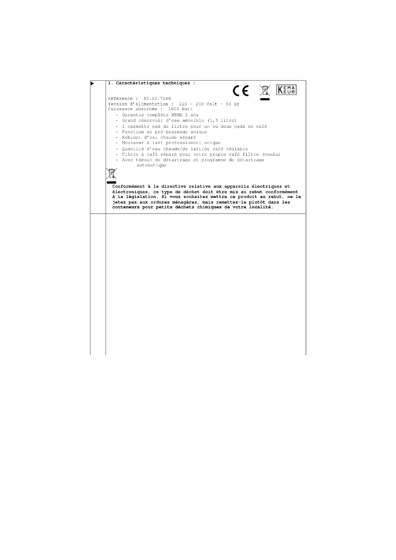 | Caractéristiques techniques | Machine à café Hema 80.00.7108, capacité de 1,2 litre, puissance de 850 W, système d'infusion à pression. |